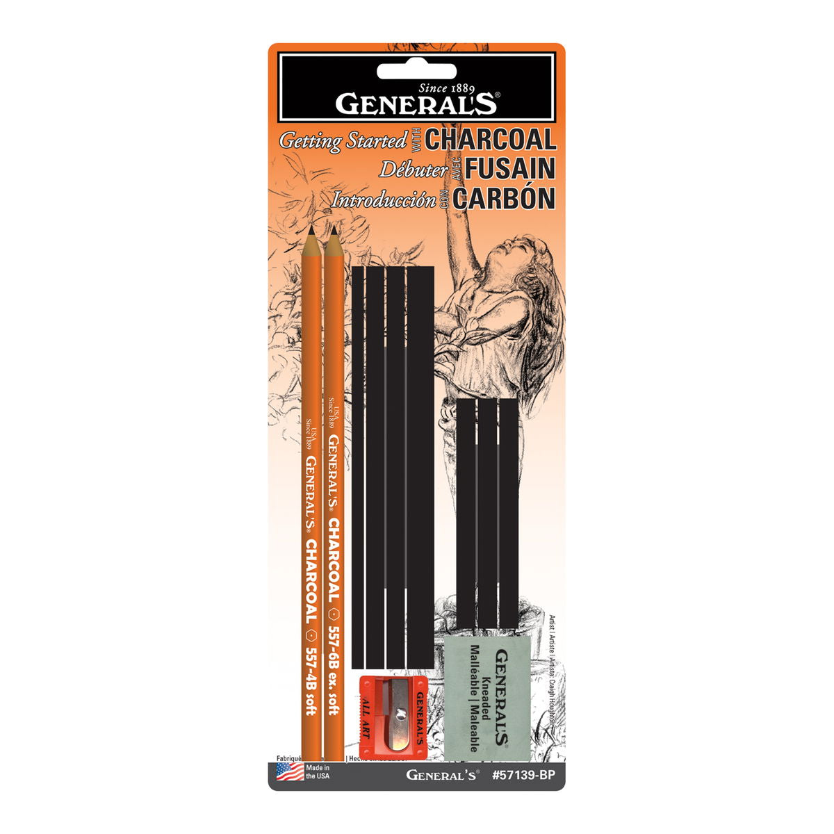 This versatile 11 piece set is an ideal introduction to all charcoal media. This set contains 2 Charcoal Pencils (4B, 6B), 4 Willow Sticks (thin, medium, thick), 3 Compressed Charcoal Sticks (2B, 4B, 6B), 1 All-Art Sharpener, and a Kneaded Eraser for erasing and highlighting. General's Charcoal Pencils are made with premium incense cedar wood for smooth sharpening and performance.