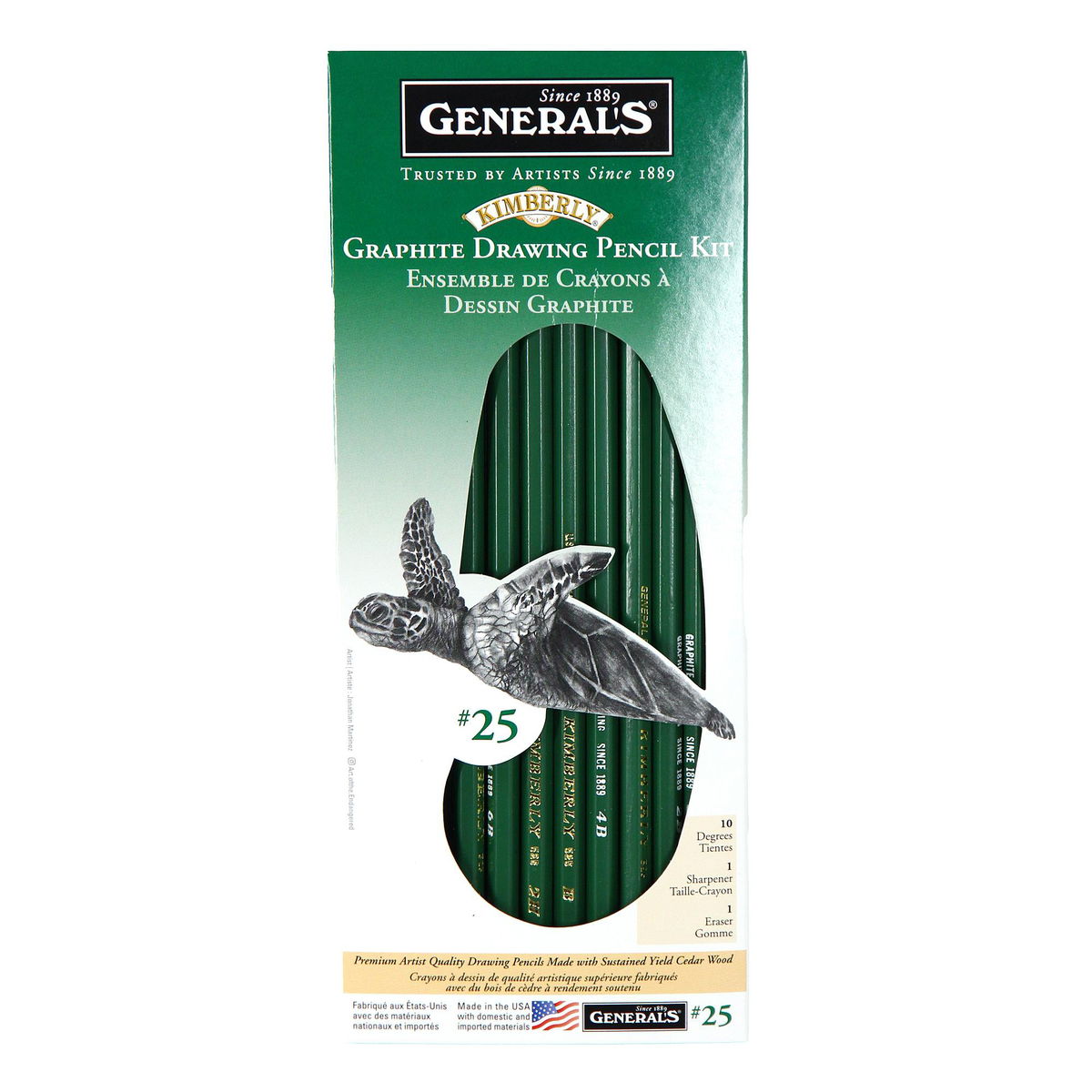 This kit contains 10 assorted degrees (4H - 8B) of premium grade Kimberly Graphite pencils. Also included is a sharpener and artist eraser. Each Pencil is hex shaped to prevent rolling, and is pre-sharpened.