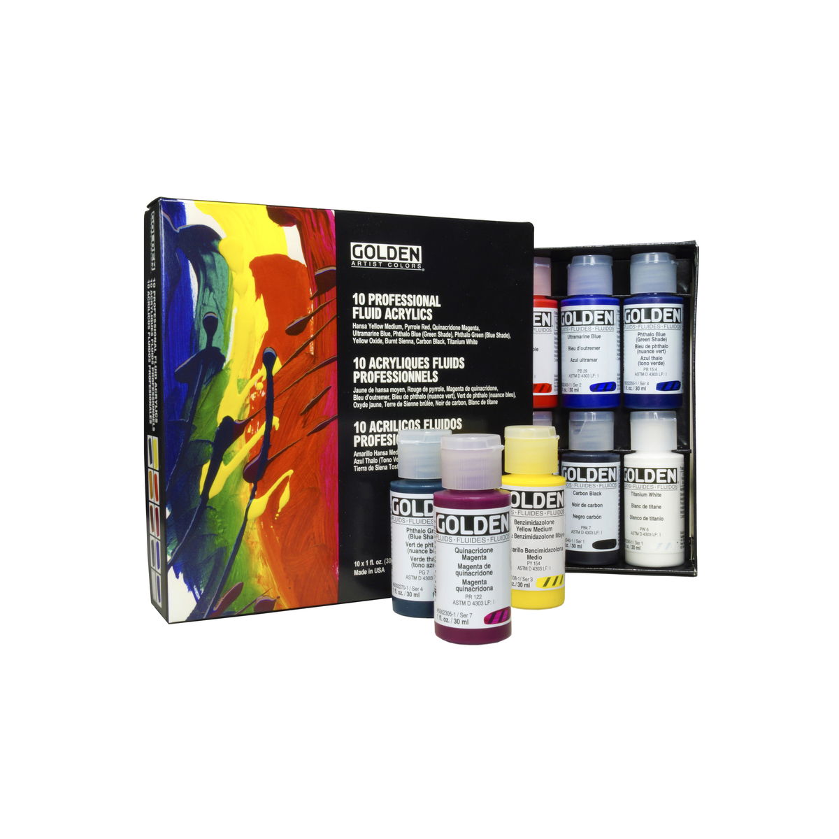 This set offers a selection of 10 Golden Professional Fluid Acrylic Colors that are fundamental to the serious artist working with fluid viscosity acrylics. The set provides artists with a cost effective means to setting up a basic palette, capable of mixing a full range of hues, tints, and shades that can later be supplemented with the wide selection of Fluid color offerings. Fluids are the most versatile paint formula produced by Golden, easily adaptable to a wide range of applications. They are ideal for spraying, brushing, or mixing with all Golden Colors including Heavy Body and Airbrush Colors. When mixed with water, or Golden Acrylic Flow Release, the Fluids are very useful for staining or watercolor techniques. Includes Ten colors in 1 fl. oz. / 30ml Bottles (Benzimidazolone Yellow Light, Benzimidazolone Yellow Medium, Naphthol Red Light, Quinacridone Magenta, Phthalo Blue (Red Shade), Phthalo Blue (Green Shade), Phthalo Green (Blue Shade), Phthalo Green (Yellow Shade), Carbon Black*, and Titanium White). *WARNING: This product contains a chemical known to the State of California to cause cancer.