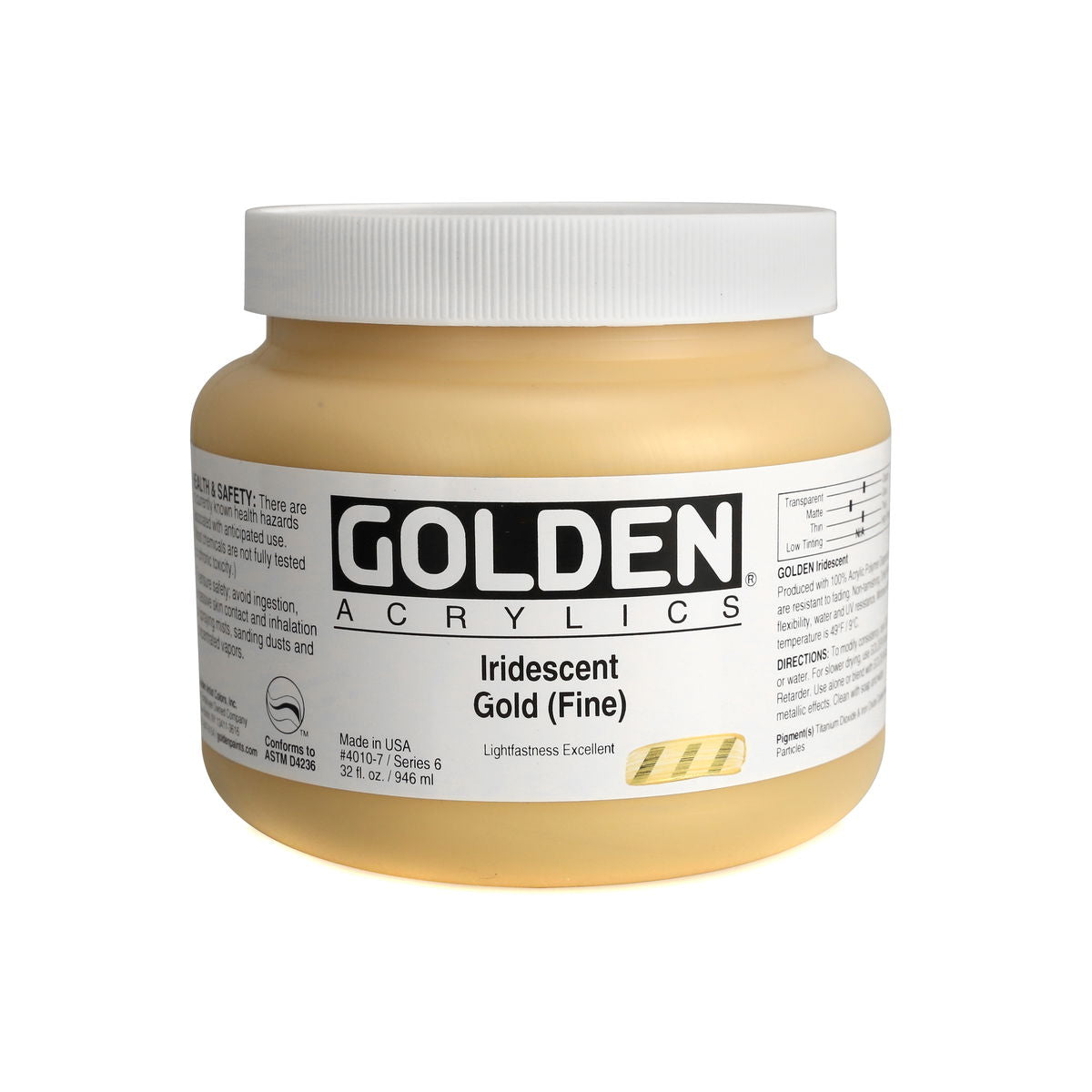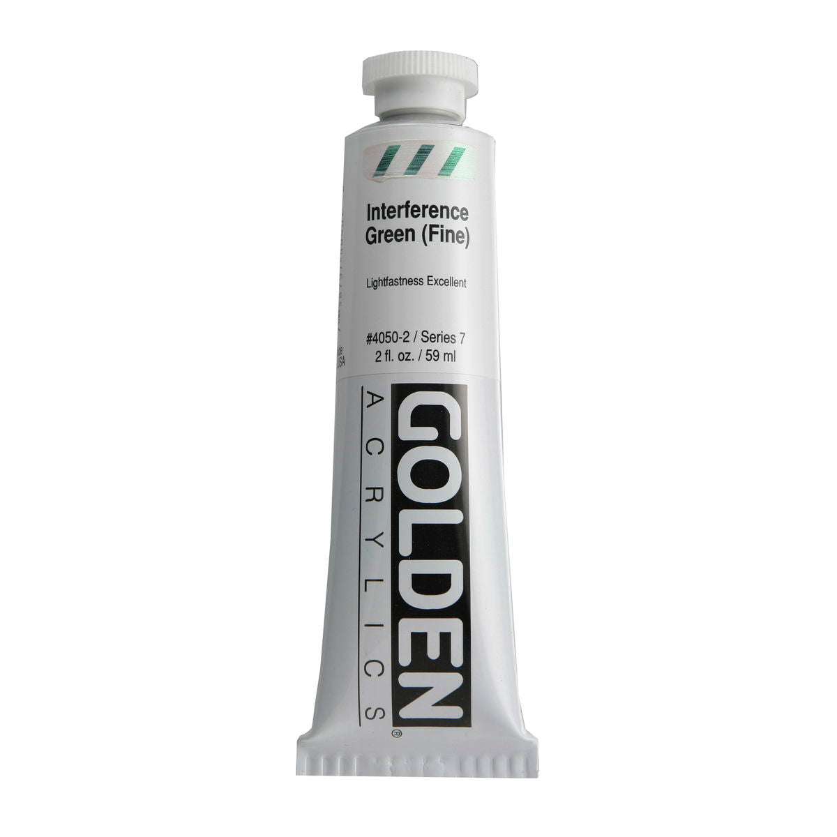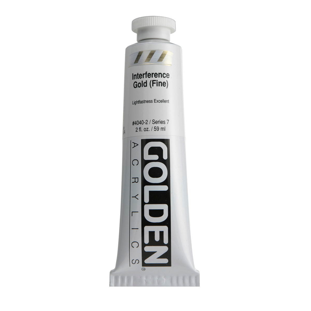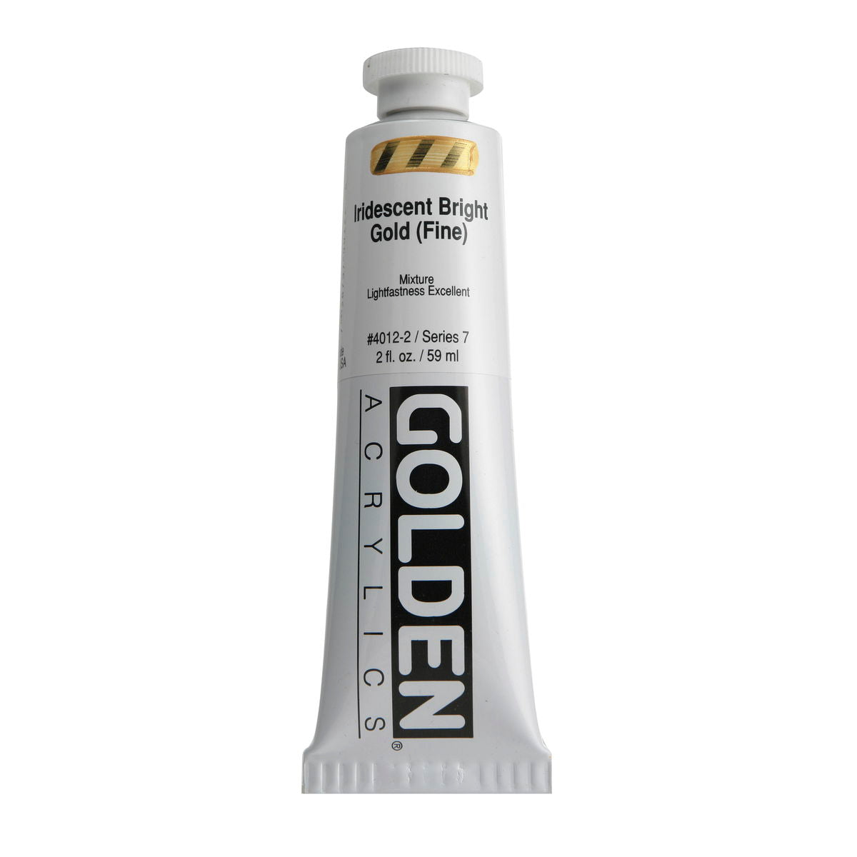 Golden Iridescent Acrylics may be used alone or with other colors, gels and mediums. Iridescent Pearl is extremely useful for mixing with other colors for pearl-like qualities. The Iridescent colors are very resistant to fading and will not oxidize or tarnish. Most Iridescent Acrylics are available in fine and coarse. Coarse Iridescents offer a range of highly reflective pigments including stainless steel and gold mica flakes. Fine Iridescent Colors offer a smooth velvety finish and blend well with other colors. Golden Interference Acrylic Colors offer a unique "interference flip" when viewed from different perspectives. Interference Colors flip between a bright opalescent color and its opalescent complement. When applied over white or lighter surfaces, the Interference Color is less obvious and the "flip" effect is more obvious. When applied over black or darker surfaces, the Interference Color is more obvious and the "flip" effect is less obvious. Adding a very small amount of black to Interference Colors produces deeper opalescent effects. Combine Interference Colors with Golden Gels (Gloss) and Golden Fluid Acrylic colors to produce an endless variety of colors and effects. Most Interference Colors are available in fine or coarse. These Golden Heavy Body Acrylics are produced with 100% Acrylic Polymer Emulsion. This produces a film with excellent flexibility, and chemical, water and UV resistance. The milky emulsion dries transparent, allowing the pigments to show their full color. Pigments are chosen for the greatest purity and permanency within each chemical class.
