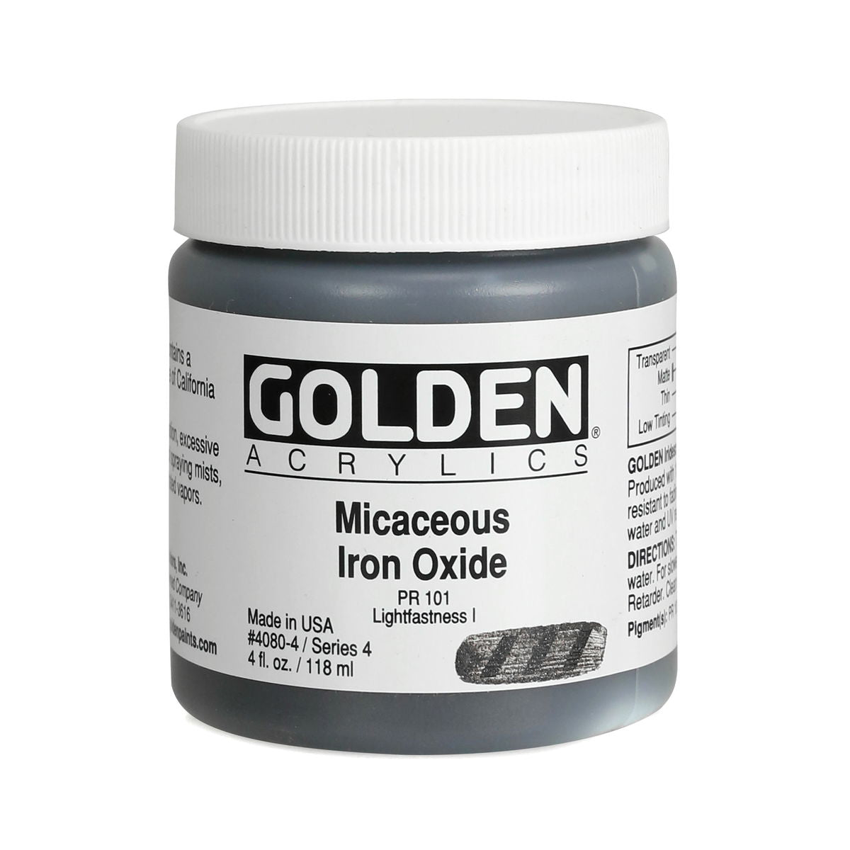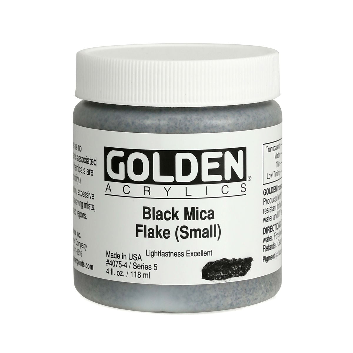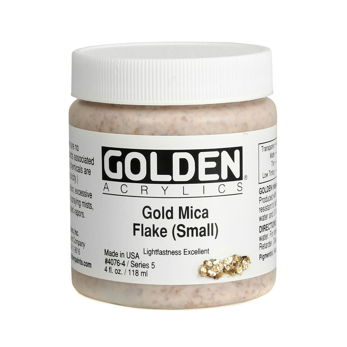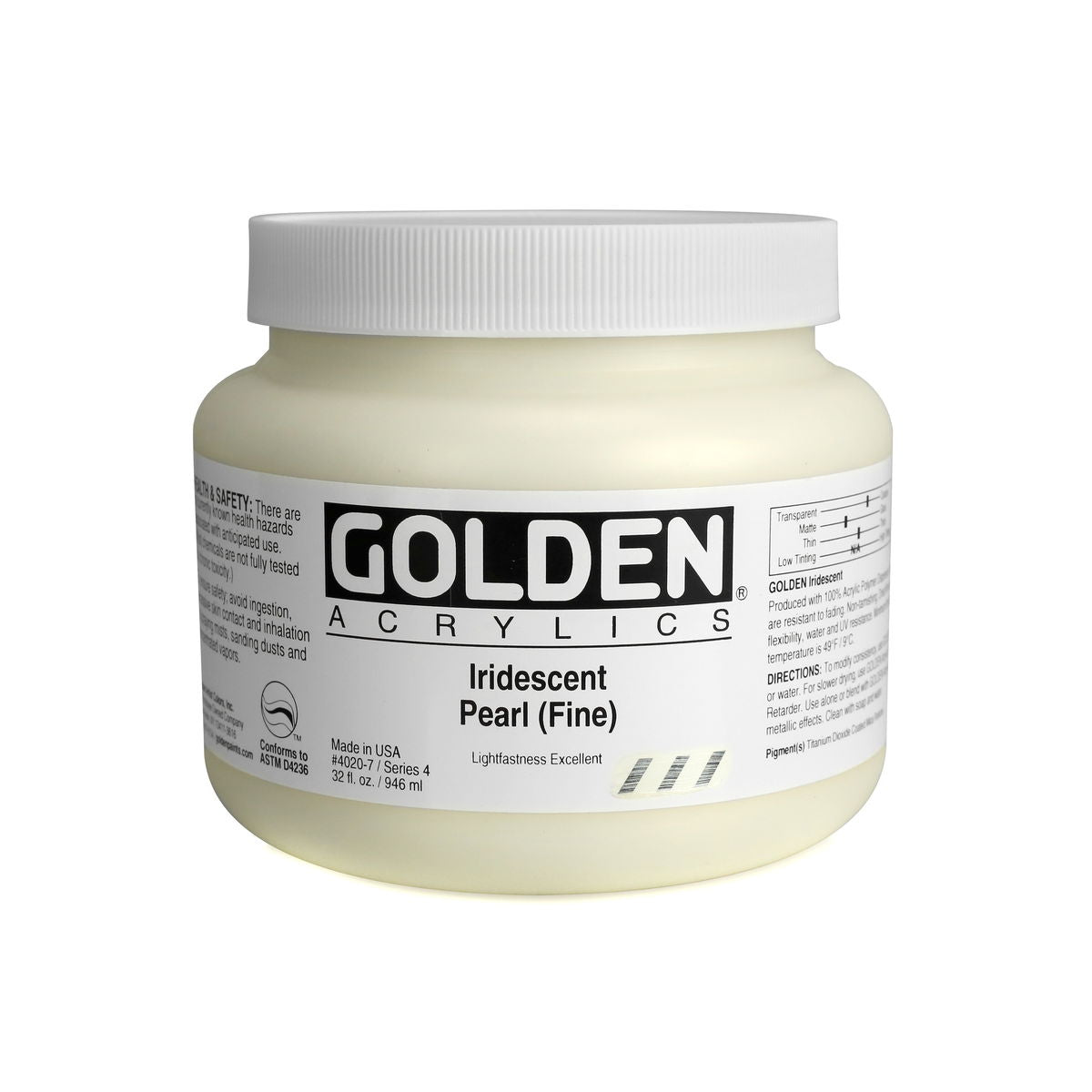Golden Iridescent Acrylics may be used alone or with other colors, gels and mediums. Iridescent Pearl is extremely useful for mixing with other colors for pearl-like qualities. The Iridescent colors are very resistant to fading and will not oxidize or tarnish. Most Iridescent Acrylics are available in fine and coarse. Coarse Iridescents offer a range of highly reflective pigments including stainless steel and gold mica flakes. Fine Iridescent Colors offer a smooth velvety finish and blend well with other colors. Golden Interference Acrylic Colors offer a unique "interference flip" when viewed from different perspectives. Interference Colors flip between a bright opalescent color and its opalescent complement. When applied over white or lighter surfaces, the Interference Color is less obvious and the "flip" effect is more obvious. When applied over black or darker surfaces, the Interference Color is more obvious and the "flip" effect is less obvious. Adding a very small amount of black to Interference Colors produces deeper opalescent effects. Combine Interference Colors with Golden Gels (Gloss) and Golden Fluid Acrylic colors to produce an endless variety of colors and effects. Most Interference Colors are available in fine or coarse. These Golden Heavy Body Acrylics are produced with 100% Acrylic Polymer Emulsion. This produces a film with excellent flexibility, and chemical, water and UV resistance. The milky emulsion dries transparent, allowing the pigments to show their full color. Pigments are chosen for the greatest purity and permanency within each chemical class.