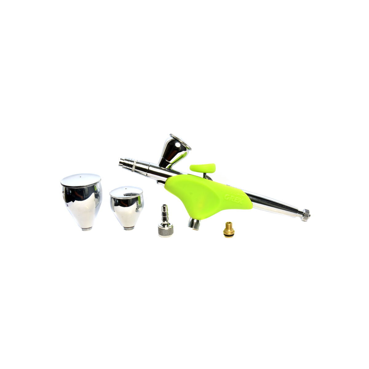 The defining design element of the Genesis XGi Double Action Gravity Feed Airbrush is the slip-on ergonomic hand grip set (patent pending) that provides improved comfort and handling. The Quick-Fit needle caps and crown cap are quick and easy to set up and remove. Designed with durable heavy nickel chrome plated housing and precisely machined stainless steel nozzle and needle. Cup design allows optimal paint flow even when the airbrush is held at an angle. Replaceable solvent proof teflon seals allows use of all medea. Includes 3 interchangable top mount reservoirs: 2ml (1/20 oz), 7ml (1/4 oz), and 15ml (1/2 oz). The included 0.5mm nozzle can be converted to 0.2mm or 0.3mm buy purchasing optional kits.