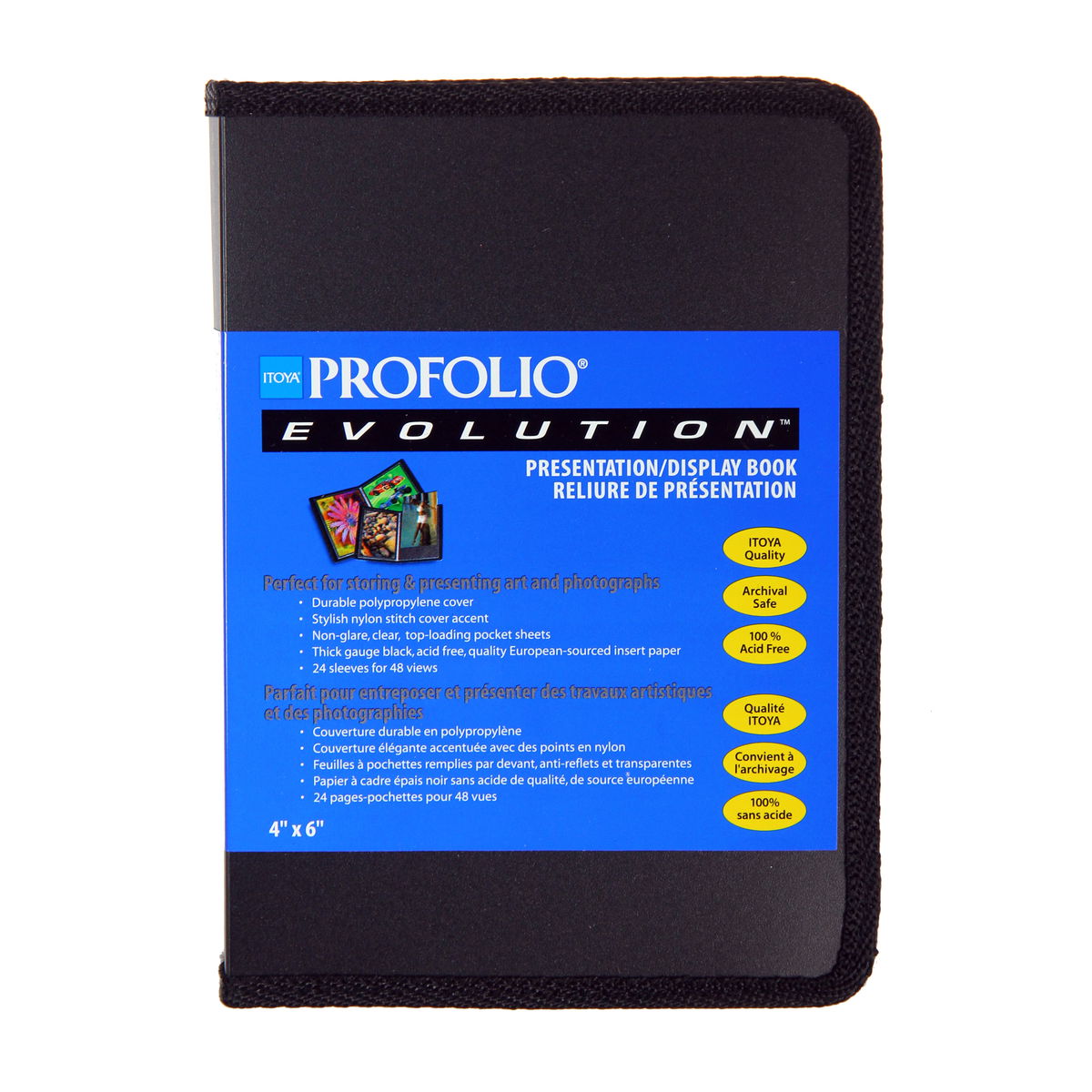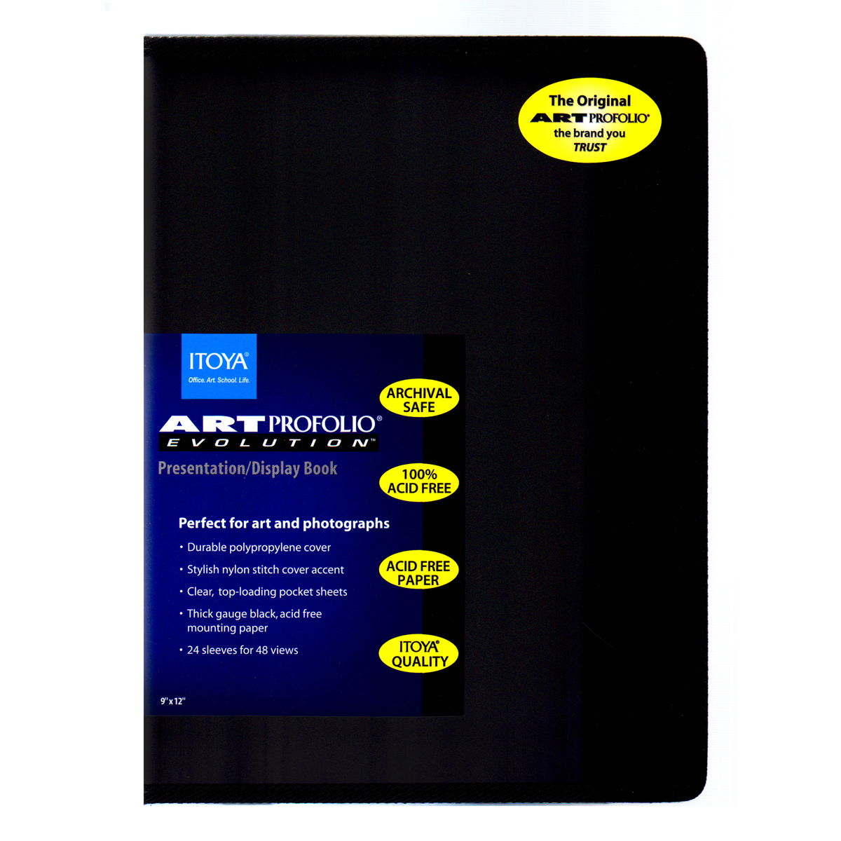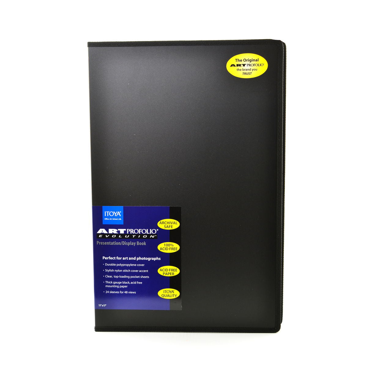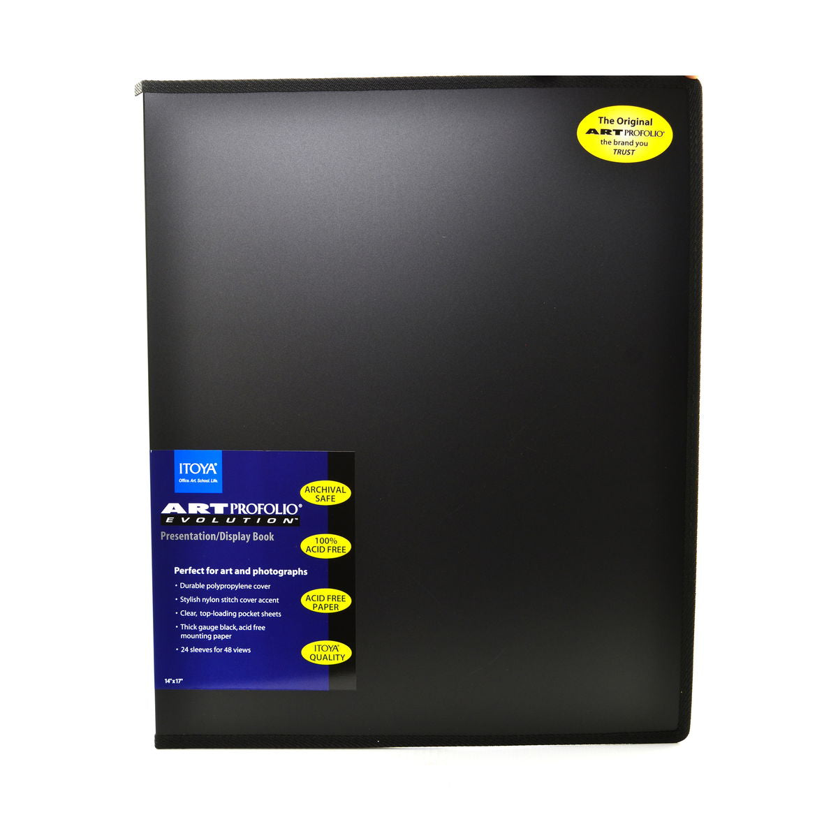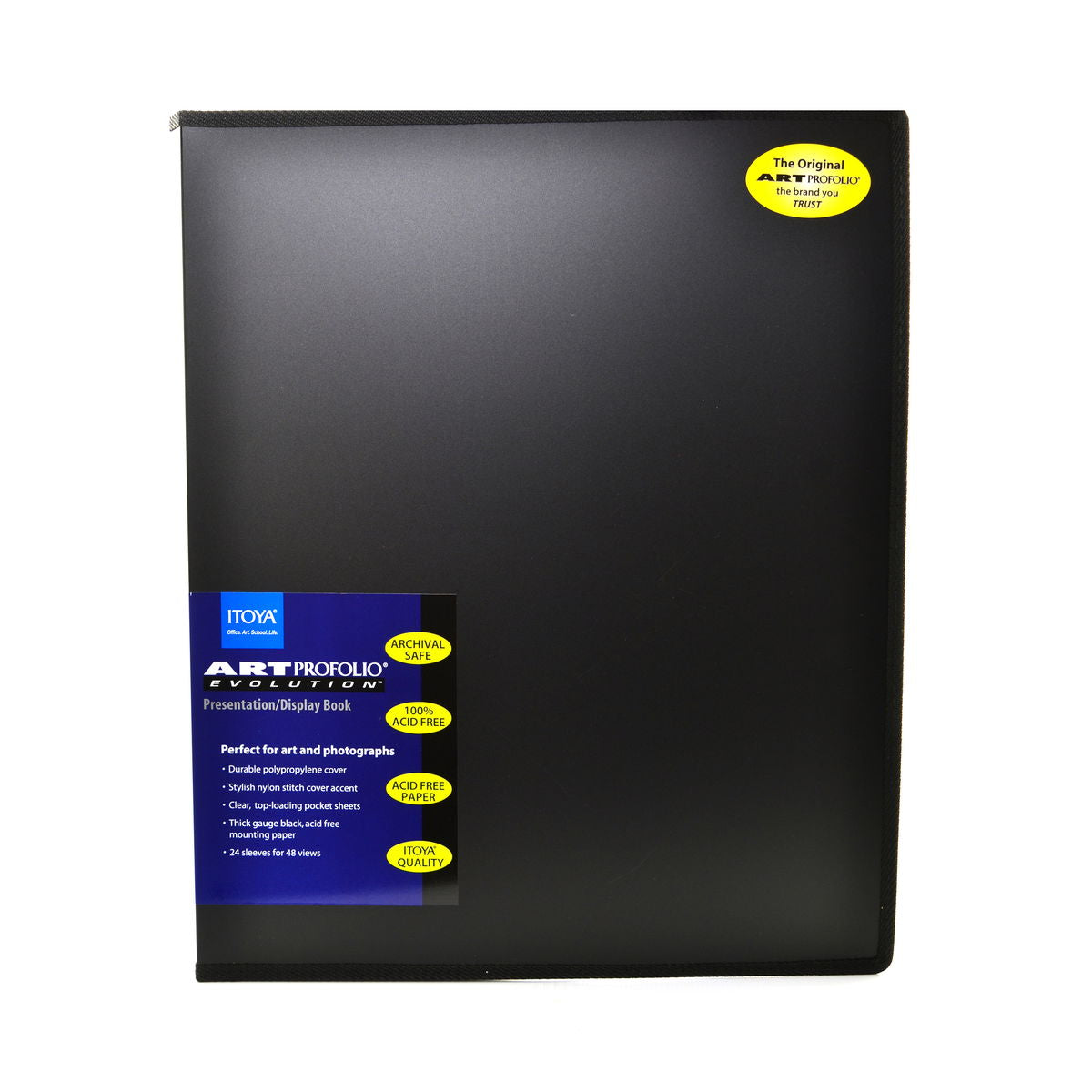 With its stylish nylon stitching and value price, the Art Profolio Evolution from Itoya is perfect for art, photo and poster storage! Each book features a durable polypropylene cover; crystal-clear, top-loading pocket sheets that resist moisture and dust; and quality crafted, thick-gauge, acid-neutral black mounting paper. The Art Profolio Evolution is completely acid-free and archival safe with 24 pocket sleeves for 48 views. Available in 12 sizes.