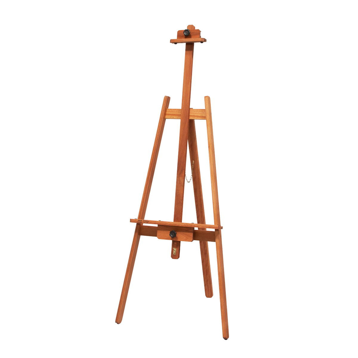 This easel adjusts easily to a variety of positions for sitting or standing and folds flat for storage. Made of eco-friendly Lyptus hardwood. Maximum canvas height is 41 1/2 in. Base width/depth is 27 1/2 in. x 22 in. Extended easel height is 58 in. Assembly required.