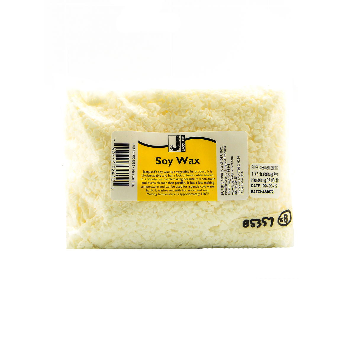 Soy Wax from Jacquard are biodegradable and emit no fumes when heated; it is popular for candlemaking, because it is non-toxic and burns cleaner than paraffin. Soy Wax has a low melting temperature and can also be used for a gentle, cold water batik dye method. It washes out with hot water and soap.