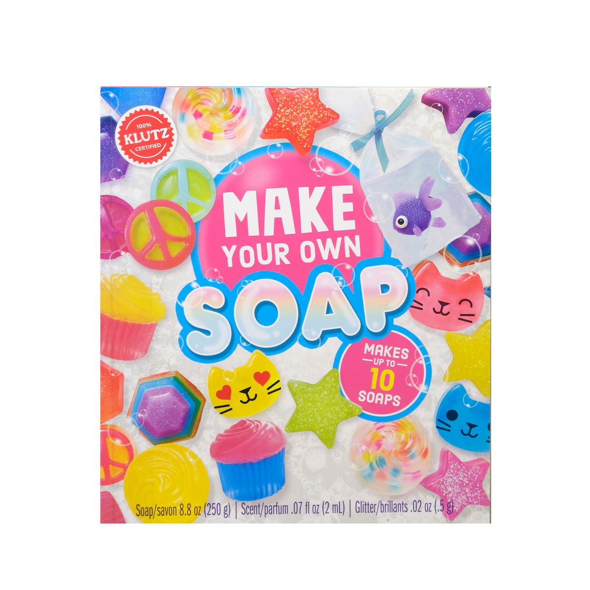 With this complete DIY soap-making kit from Klutz, you ll be on your way to being squeaky clean in no time. The Make Your Own Soap kit provides the materials to mold up to 10 soaps from scratch while adding bright colors, shimmering accents, and a pleasant scent. The reusable soap mold allows you to form soaps shaped like stars, peace signs, and hexagons. You can add the included emoji stickers to the crescent shape to create the face of a cat, and two of the molds can combine to form a cupcake. Plus, while you're waiting for your signature soap to cool and harden, you'll enjoy the added soap-based science experiments you can do right in your own kitchen. It's 100% Klutz-certified, good, clean fun. Includes: 20 blocks of clear soap base, soap mold with 6 shapes, 20 color tablets, cosmetic-grade glitter, coconut papaya fragrance, skin-safe soap stickers, 2 paper boats, a clear cellophane bag, a toy fish, ribbon, a gift tag, and a gift box. An illustrated booklet contains safety info, step-by-step instructions, science experiments, project ideas, and tidbits of science-related explanations and facts. Ages 6 and up. Parental supervision is required while working with hot melted liquid.