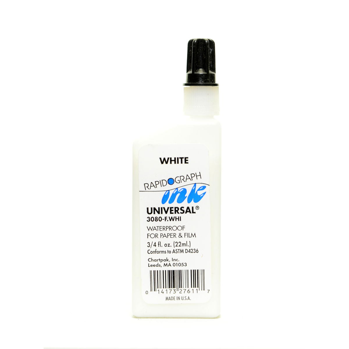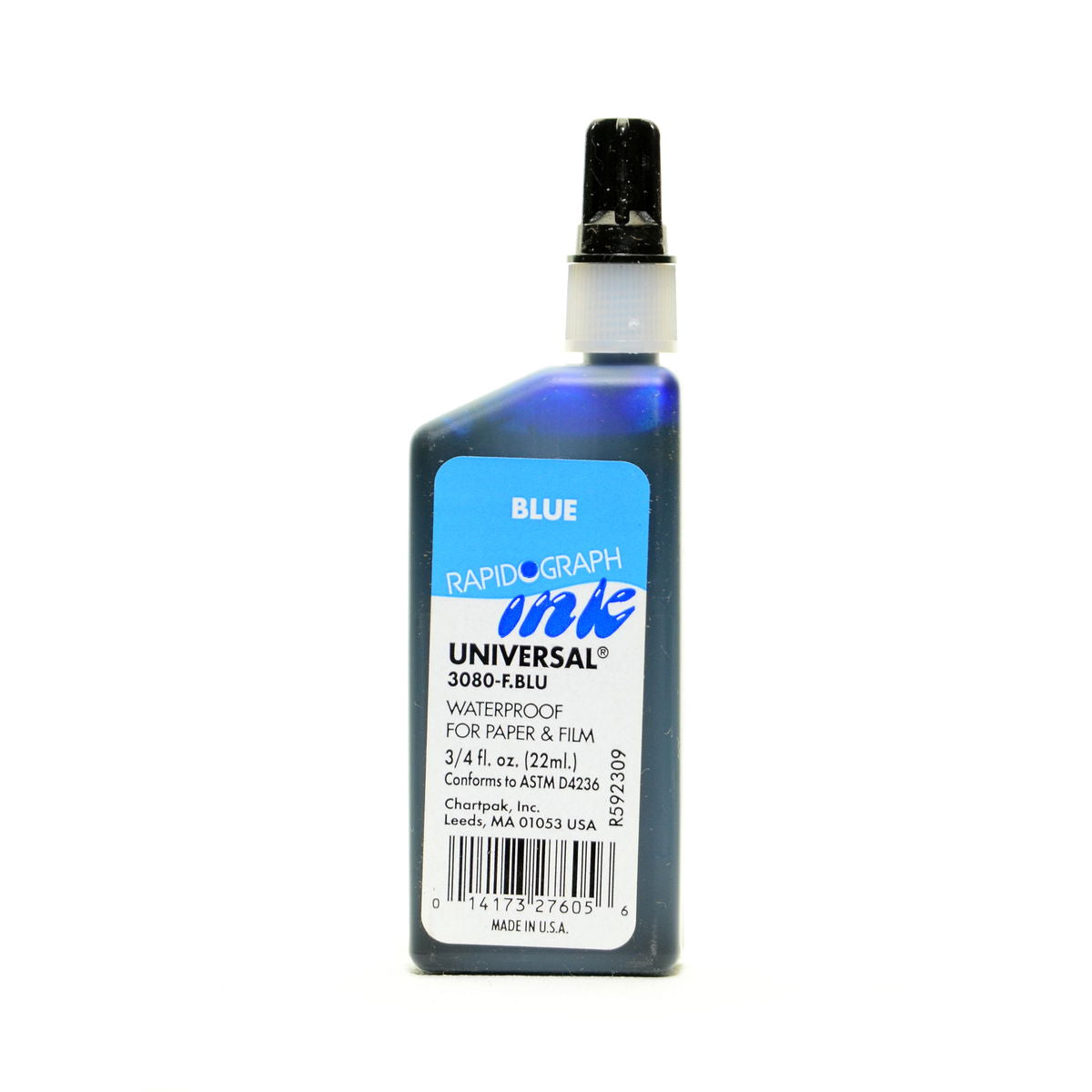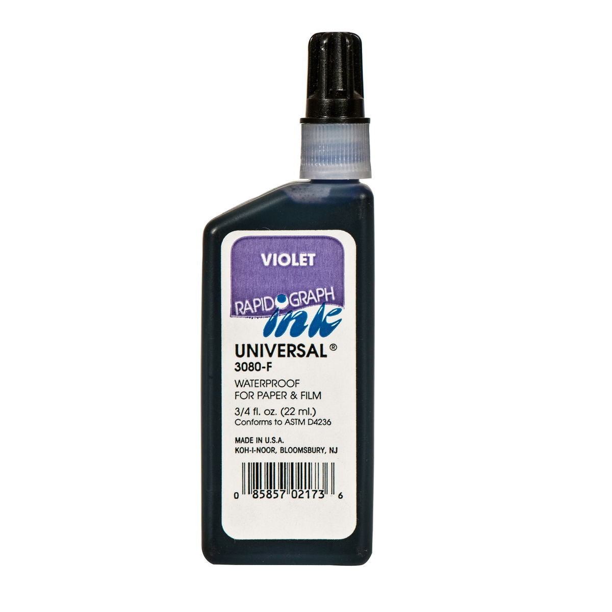 Universal Drawing inks are suitable for a variety of applications including use in technical pens and refillable plotting points. White and black are opaque, other colors are transparent. For use on paper and film. Waterproof. #3080-F. Rapidraw is a fast drying waterproof ink for film. Erasable on film, short open pen time. Good ink for experienced technical pen users. #3084-F. Ultradraw ink is for use on paper and features slow drying ink for long open pen time. Good for beginning technical pen users. #3085. All inks 3/4 oz. with easy fill spouts.