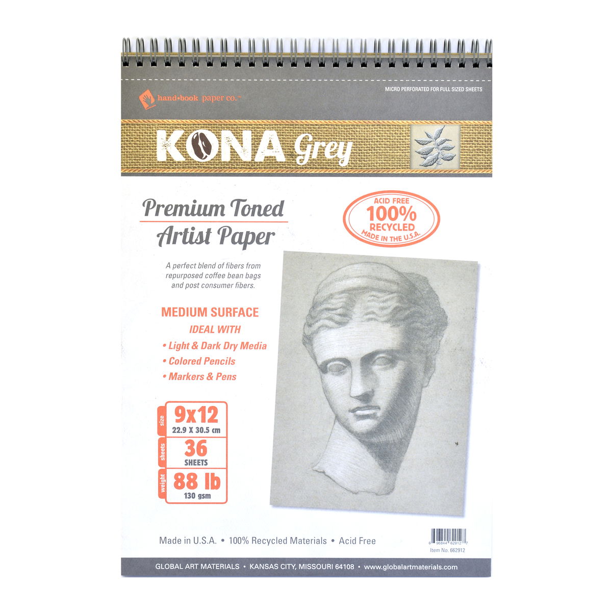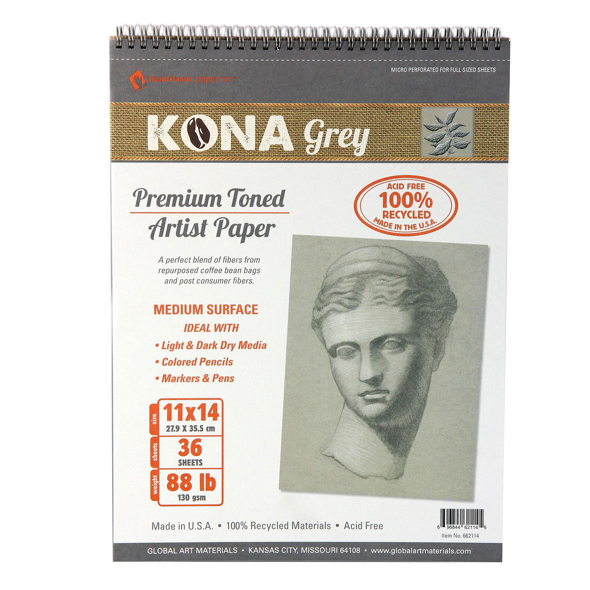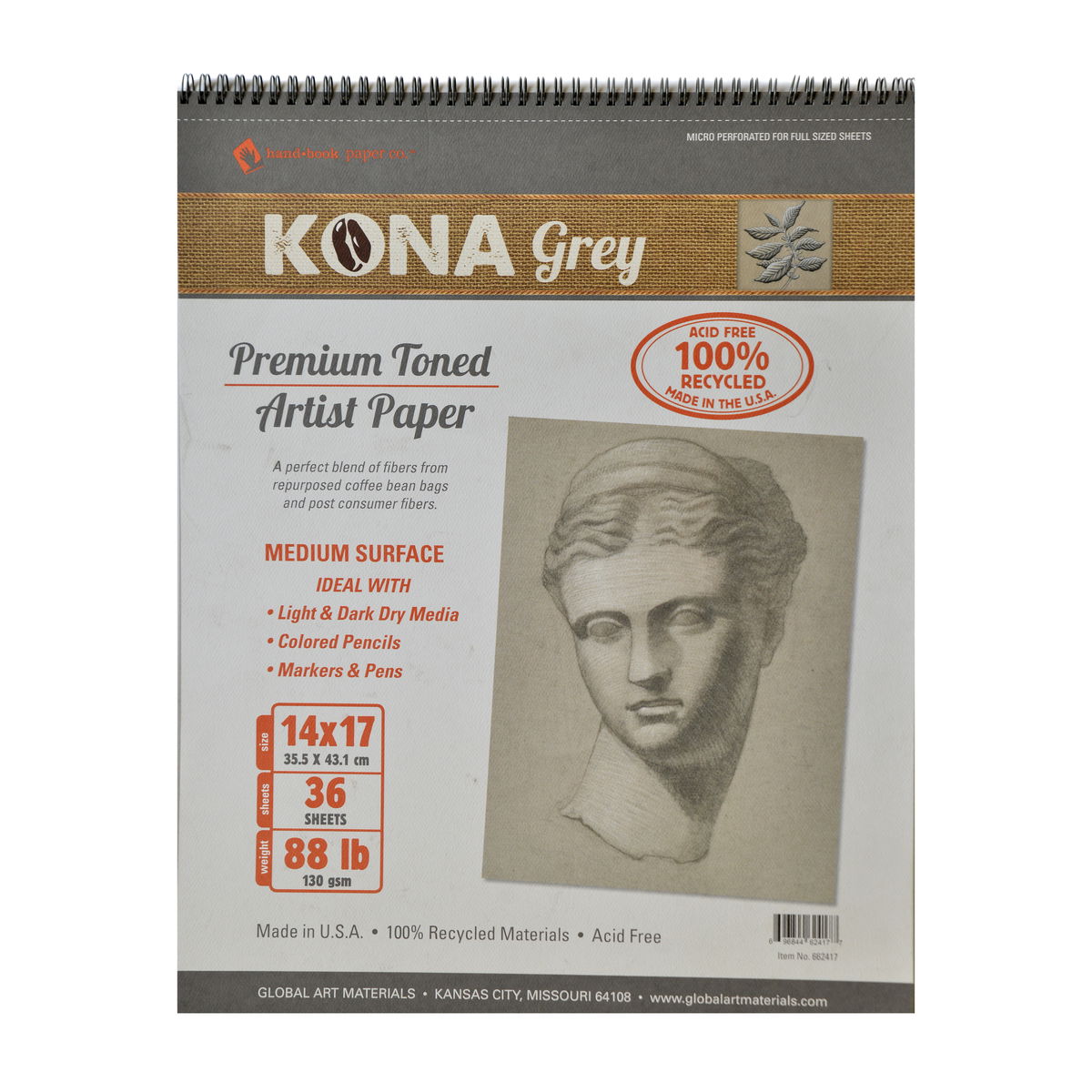 Millions of imported coffee bean bags are sent to landfills each year. Properly recycled, the long, strong jute fibers in these bags help create an ideal surface for toned artist paper. Kone Classic Premium Toned Artist Paper is a perfect blend of fibers from repurposed coffee bean bags and post consumer fibers with an ideal tooth and superior surface for a variety of light and dark dry media, colored pencils, markers and pens. Avalable in tan and grey toned micro-perforated pads.