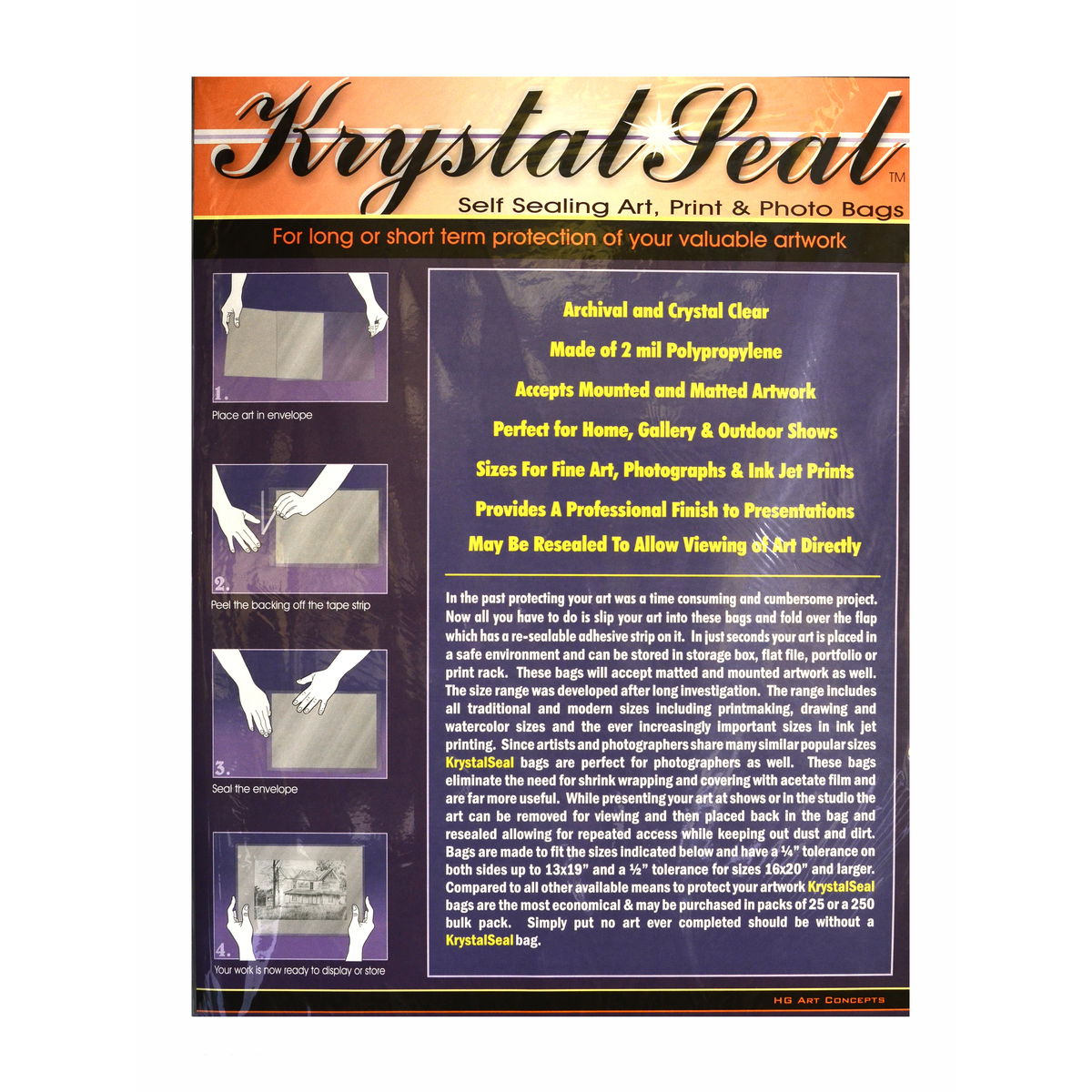 These self sealing art, print and photo bags are great for storing prints, drawings, watercolors, and mounted artwork. Krystal Clear bags are archival and made of 2 mil Polypropylene. They provide a professional finish to presentations and are perfect for home, gallery and outdoor shows. Make protecting your artwork easy and worry-free!