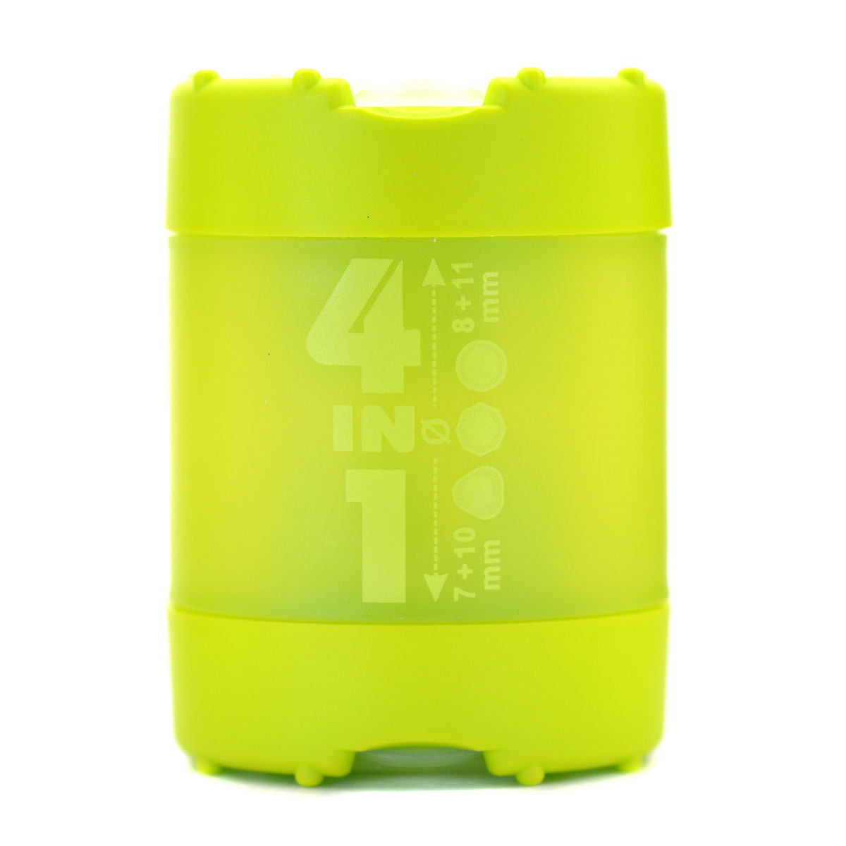 With the Kum 4 in 1 Sharpener you ll have more difficulty finding a pencil that it can t sharpen! This sharpener features a 2 hole sharpener on one end for 8 & 11 mm diameter pencils, and on the other end a 2 hole sharpener for 7 & 10 mm diameter pencils. The 4 in 1 Sharpener collects shaving, and can be empted from both end which feature caps to keep shavings from falling loose