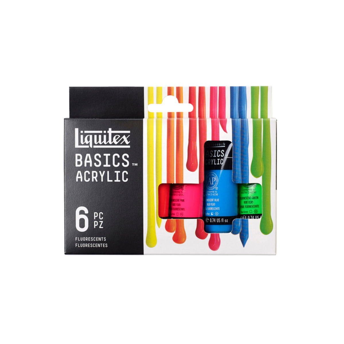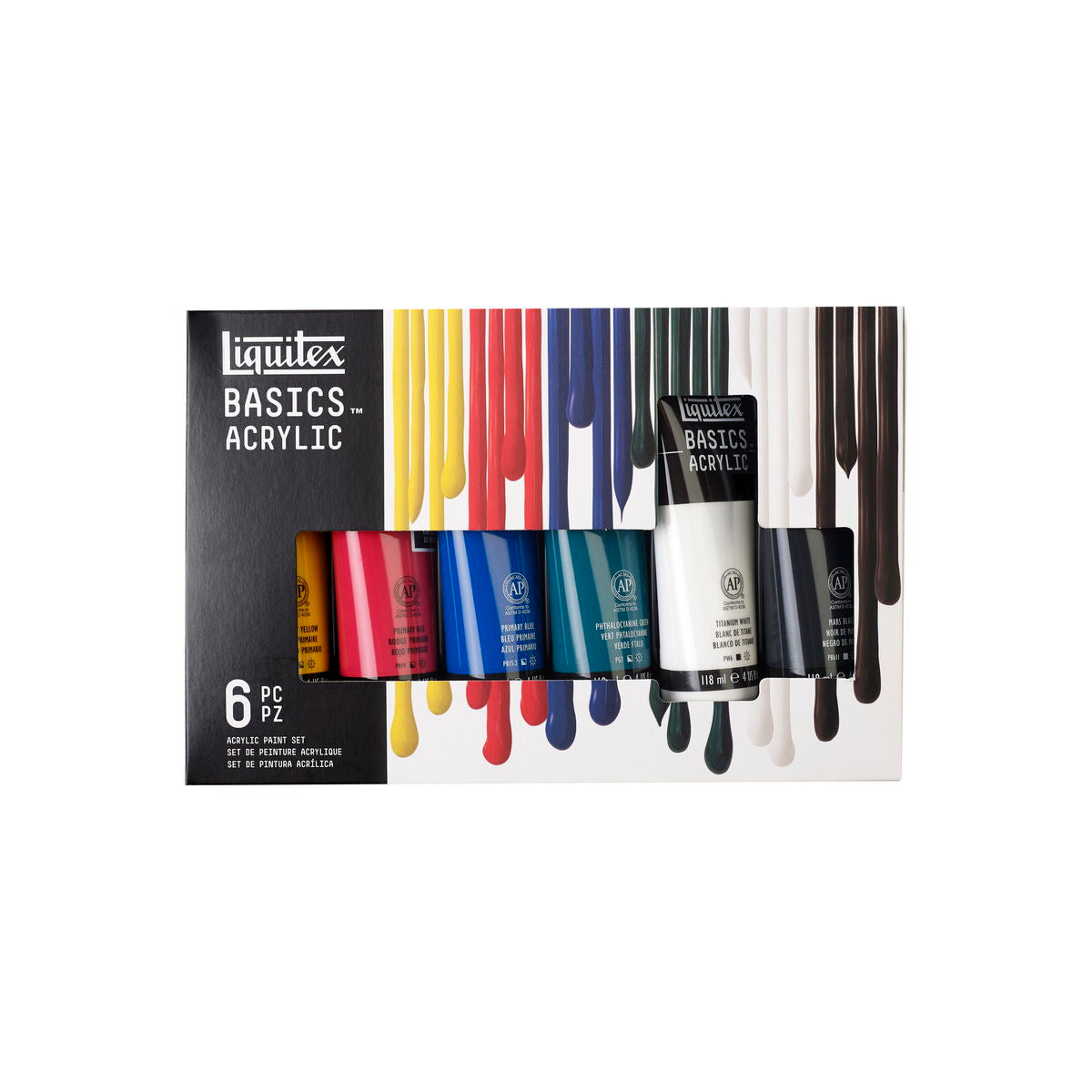 Basics Acrylics are formulated to offer great coverage, outstanding color brilliance, and exceptional brushability. The buttery consistency, medium viscosity, and lightfast fine art pigments make these acrylics perfect for all painting techniques - from watercolor, airbrush, and printmaking to thick applications that simulate oil paints. Water soluble when wet, they are permanent, water resistant, and flexible when dry. 6 X 118ML SET includes primary yellow, mars black, phthalo green, primary blue, primary red, and titanium white. FLUORESCENT SET includes 22ml tubes: fluorescent colors yellow, orange, red, pink, blue, and green. METALLIC & IRIDESCENT SET includes 22ml tubes: metallic gold, metallic silver, metallic bronze, metallic copper, iridescent graphite, and iridescent white. FREE WHITE TUBE SET includes 75ml primary yellow, naphthol crimson, ultramarine blue, mars black, and a bonus free tube of titanium white. 8 X 75ML SET includes primary red, primary yellow, primary blue. hookers green hue, yellow oxide, burnt umber, mars black, and titanium white. 4X75ML and 1X118ML SET includes 75ml tubes primary red, primary blue, primary yellow, and mars black. Plus one 118ml tube of titanium white. STARTER BOX ASSORTED SET includes 1 each 75ml primary red, primary blue, primary yellow, hooker s green hue permanent, burnt umber, yellow oxide, mars black, and 2 each 75 ml titanium white. Also includes 1 BASICS 6 short handle brush pack, color chart, and reusable box. WET on WET TECHNIQUE SET includes 1 each 75ml primary red, primary blue, primary yellow, mars black, and 2 each 75ml titanium white, 1 each 100ml professional slow-dri blending medium, and 1 basics brush. BLENDING TEXTURE TECHNIQUE SET includes 1 each 75ml primary red, primary blue, primary yellow, mars black, and 2 each 75ml titanium white, 1 each 100ml professional modeling paste, palette knife, and educational booklet. 6 X 22ML SET includes primary yellow, primary red, phthalocyanine green, primary blue, mars black, and titanium white. 12 X 22ML SET includes alizarin crimson hue permanent, primary red, cadmium orange hue, burnt sienna, burnt umber, primary yellow, light green permanent, phthalocyanine green, primary blue, dioxazine purple, ivory black, and titanium white. BEST SELLERS SET of 24 X 22ML includes primary yellow, cadmium yellow medium hue, cadmium yellow deep hue, cadmium orange hue, cadmium red medium hue, naphthol crimson, cadmium red deep hue, medium magenta, dioxazine purple, ultramarine blue, phthalocyanine blue (green shade), primary blue, light blue permanent, bright aqua green, hooker s green hue permanent, light green permanent, burnt sienna, burnt umber, mars black, ivory black, unbleached titanium, titanium white, silver, and gold. 36 X 22ML SET includes alizarin crimson hue, burnt sienna, burnt umber, cadmium orange hue, dioxazine purple, ivory black, light green permanent, phthalo green, primary blue, primary red, primary yellow, titanium white, cadmium red light hue, cadmium yellow medium hue, cerulean blue hue, cobalt blue hue, hookers green hue permanent, phthalo blue, quinacridone magenta, raw sienna, raw umber, red oxide, ultramarine blue, yellow oxide, bright aqua green, cadmium red deep hue, cadmium red medium hue, cadmium yellow deep hue, cadmium yellow light hue, deep green permanent, deep violet, gold, neutral gray value 5, silver, naphthol crimson, and mars black. 48 X 22ML SET includes all the colors of the 36 count set plus: brilliant yellow green, light blue permanent, light portrait pink, bronze, light blue violet, naples yellow hue, unbleached titanium, brilliant purple, bronze yellow, medium magenta, copper, and prism violet. 12 X 118ML SET Contains 12 x 118ml tubes Primary Yellow Cadmium Orange Hue Alizarin Crimson Hue Permanent Primary Red Dioxazine Purple Primary Blue Phthalocyanine Green Light Green Permanent Burnt SIenna Burnt Umber Titanium White Mars Black