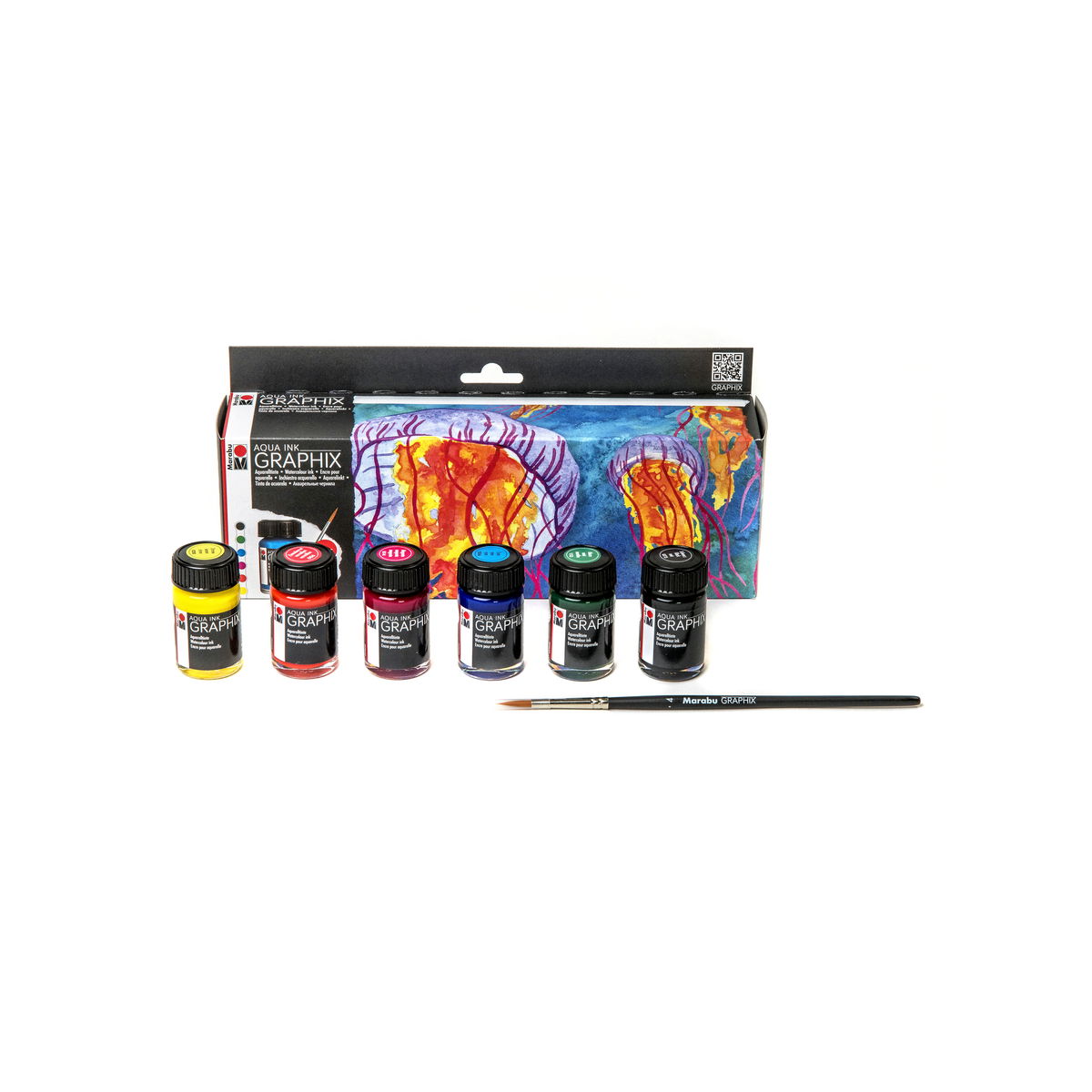 Marabu Graphix Aqua Inks are highly-pigmented, water-soluble inks ideal for drawing bold lines and smooth sweeps of vibrant color. The naturally transparent and lightfast formula makes it perfect for lettering and calligraphy; simply use a dip pen! Aqua Inks can be reactivated with water even after they dry.