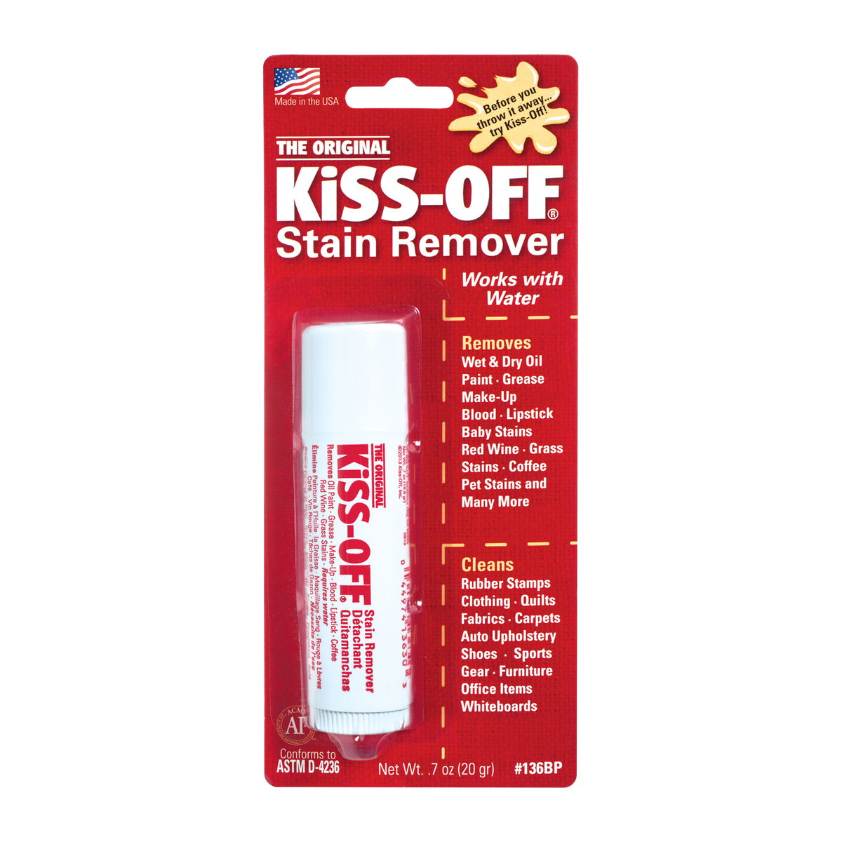 On the spot stain remover. Removes many hard to get stains. This all purpose stain remover is ideal for wet or dry oil paint tempera, clean/conditions rubber stamps as well as spots, blood and pencil marks on quilting. Also removes lipstick, make-up, baby spots, wine, grass stains, coffee, pet stains, and grease. It works on fabrics, carpet, car interiors, and computers. Just apply water, Kiss-Off and rinse! Non-toxic.