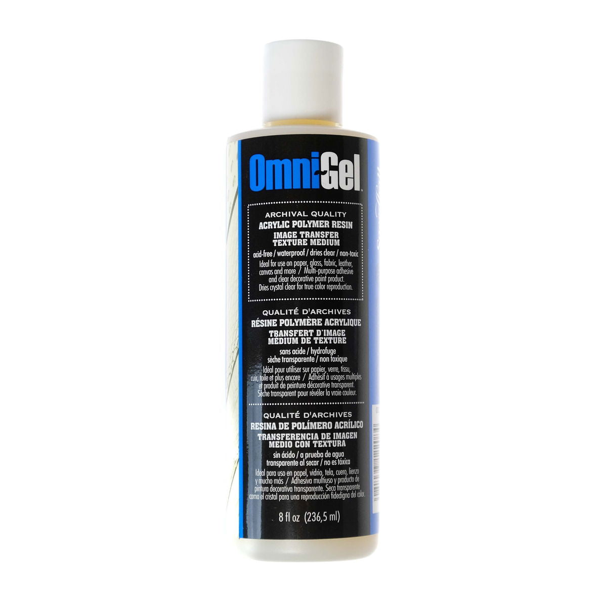Omni-Gel is a versatile transfer medium. it can also be used to emphasize the brush strokes with oil painting effects, making prints look like original paintings. Use Omni-Gel as a glue to attach transfers to paper, most fabrics, leather, wood, metal, ceramic, brick, plastic, rubber, or glass. When applied, Omni-Gel is milky white and dries clear. It should be used in temperatures of 72 degrees or higher. Acid free, waterproof, and flexible. Create gloss or matte effects. Instructions for use included on bottle.