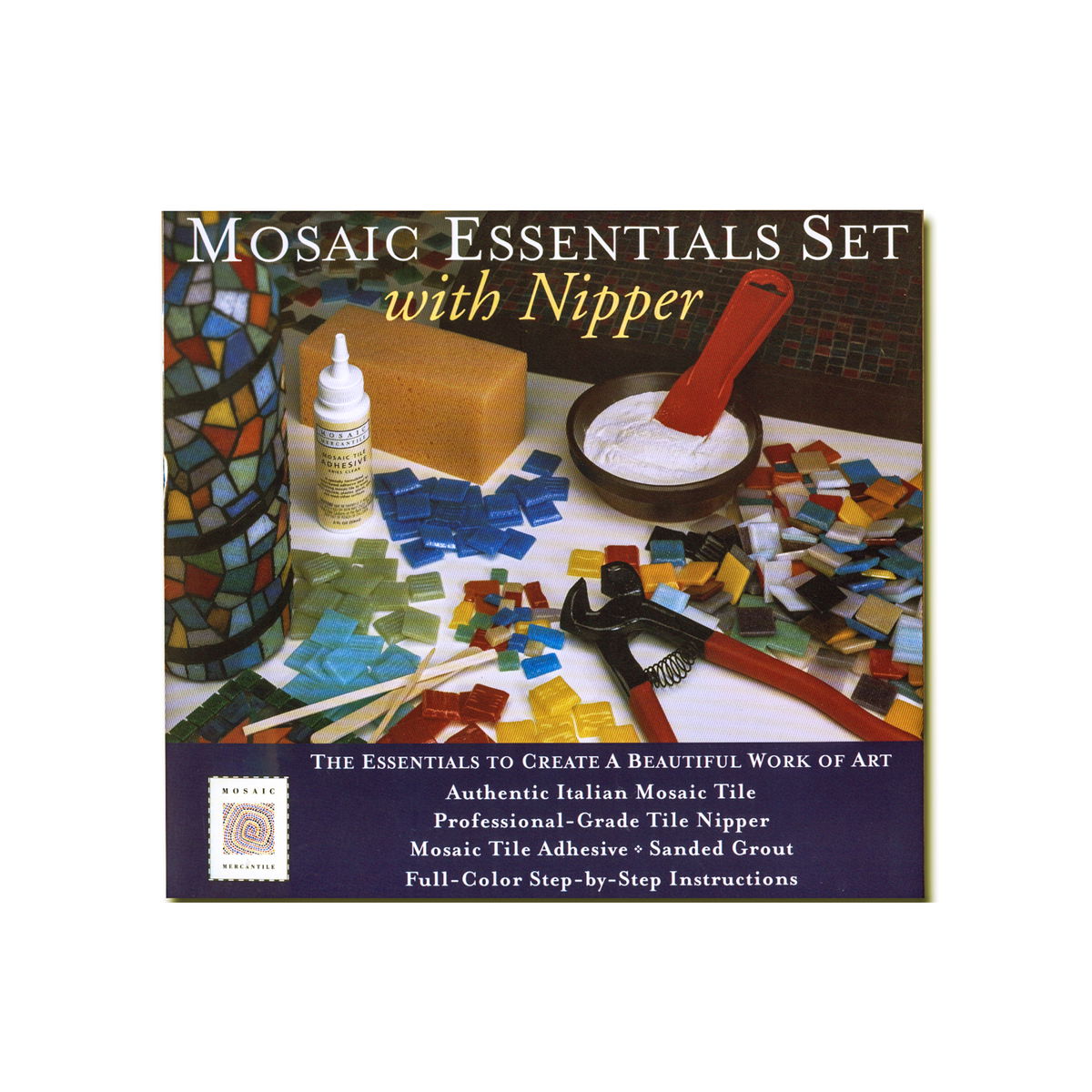 This set contains the essentials to create a beautiful work of art. And it's easy to use, even for the novice. This set contains 1 lb. of assorted colors of Italian Vitreous glass tile, tungsten carbide tipped mosaic tile nipper, 1 lb. of sanded tile grout, grout spreader tool, grout sponge, 2 oz. bottle of mosaic tile adhesive, wooden applicator sticks, latex gloves, and full color step-by-step instructions. Just nip tile, glue, position tile, and grout.