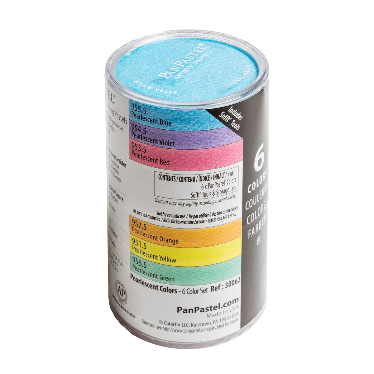 Contains all 6 Pearlescent Colors. Pearlescents can be used on their own or mixed with the original colors for custom pearl effects. Set Contents: 1 x Pearlescent Blue 955.5 1 x Pearlescent Violet 954.5 1 x Pearlescent Red 953.5 1 x Pearlescent Orange 952.5 1 x Pearlescent Yellow 951.5 1 x Pearlescent Green 956.5 2 x Sofft Mini Applicator 2 x Sofft Sponge Bars 4 x Sofft Knife Covers (No.1 & No.2) 2 x Storage Jars