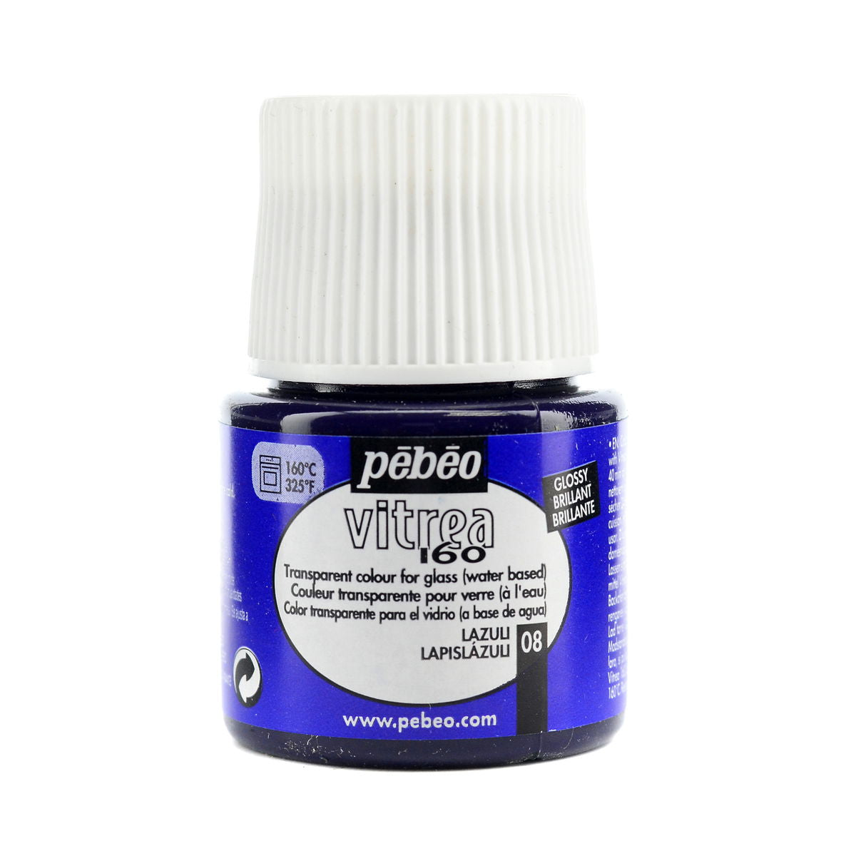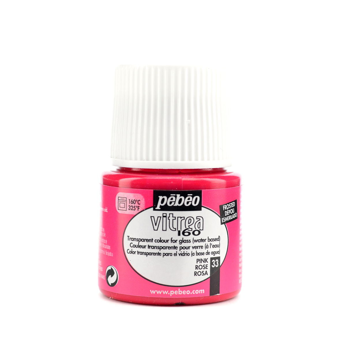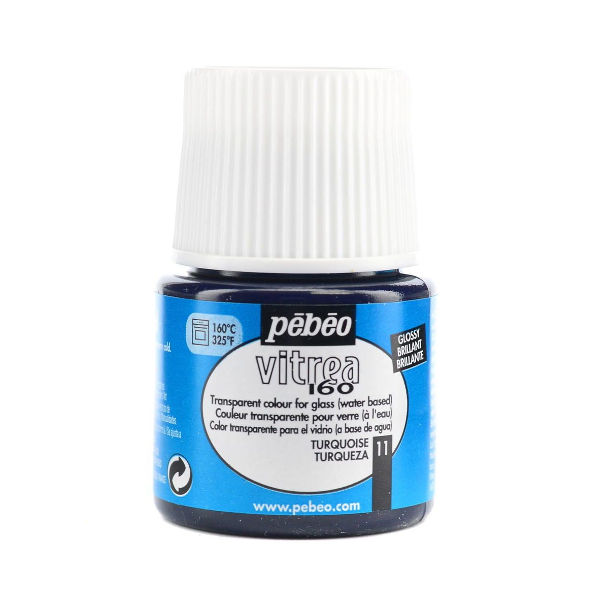 Pebeo Vitrea 160 colors are transparent, water-based paints for use on glass. Use Vitrea 160 glossy or frosted colors to create vivid artwork that gathers gorgeous light. Vitrea 160 colors become dishwasher-safe after baking. Available in 1.5-ounce (45 ml) bottles.
