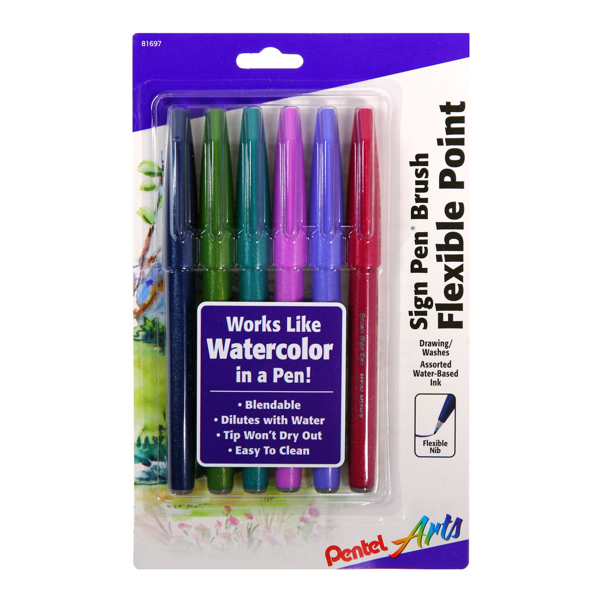 Sets of Brush-Tip Sign Pens in assorted ink colors. Radiant, water-based ink produces expressive, bold lines. Snap-fit cap prevents the firm, durable tip from drying out when not in use. Ideal for artists or anyone who enjoys writing and drawing. Perfect for general writing, drawing, doodling and adding character to any signature. ACMI Certified Nonrefillable