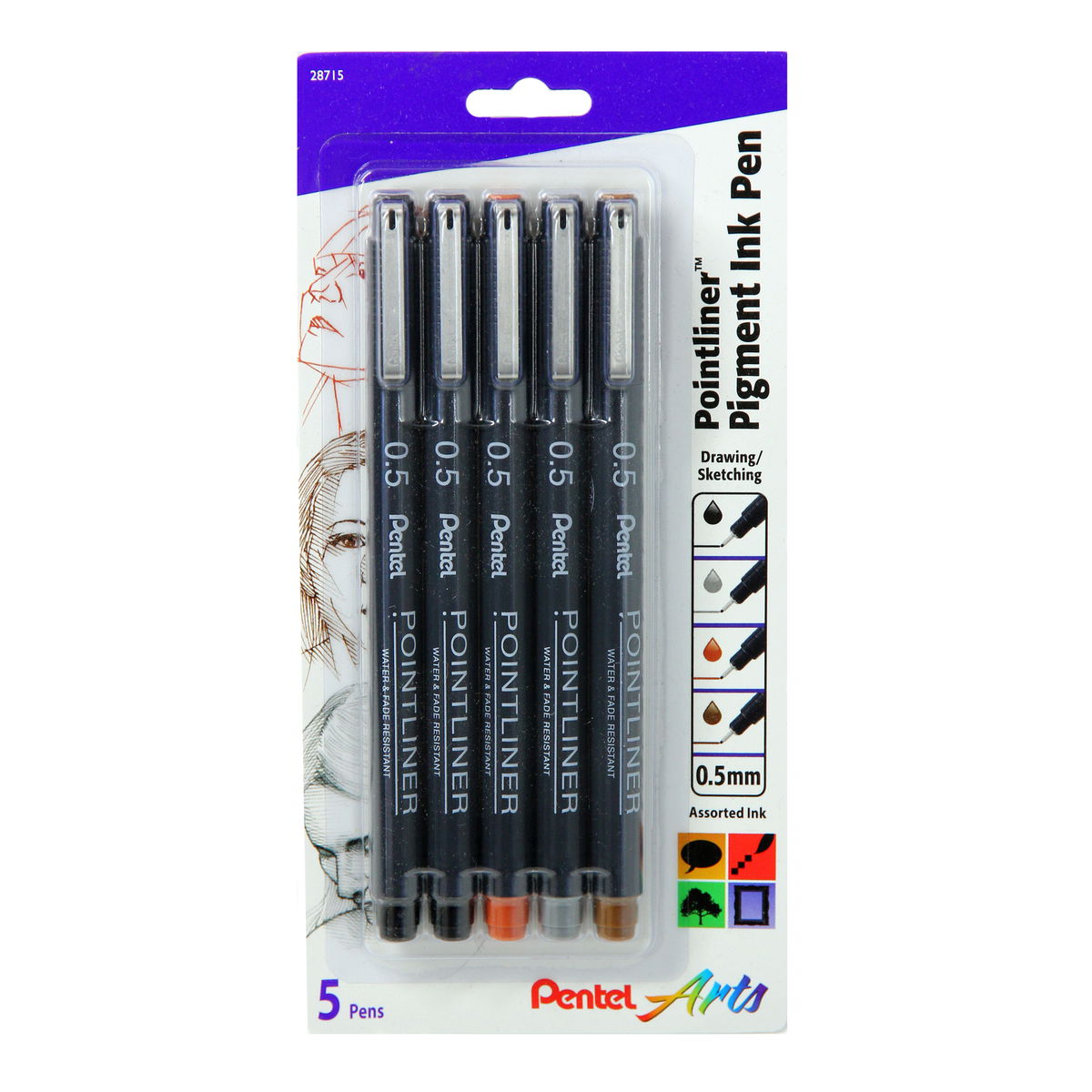Pentel Pointliner Pigment Pens have consistent ink flow perfect for shading techniques. The waterproof ink dries quickly and integrates well with watercolor washes and the durable plastic nib doesn't degrade or split over time. The Assorted Ink color Set of 5 contains 2 black pens and one each gray, sanguine and sepia pens.