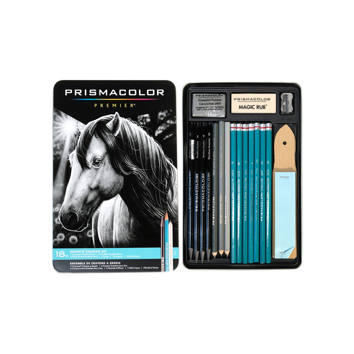 Create stunning and deep artwork with the Prismacolor Graphite Pencil Set. This set is specifically designed to give beginning artist everything they need render detailed line work, a vast range of highlights, mid-tones, and shadows, and cover large areas. Prismacolor s unique high quality pencils sharpen to a fine and resists crumbling. The set includes 7 seven pencils (6H, 4H, 2H, B, 2B, 6B, 8B), 4 woodless graphite pencils (2B, 4B, 6B, 8B), and 3 water-soluble graphite pencils (HB, 4B 8B), kneaded eraser, Magic Rub eraser, pencil sharpener, and sandpaper pointer.