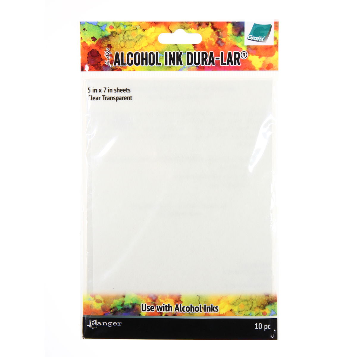 Tim Holtz Alcohol Ink Dura-Lar Clear is a versatile surface suited for permanent inks & mixed media techniques. Dura-Lar Clear is a transparent 110lb cover film that is heat tolerant and non-absorbent. Great for use with Tim Holtz Alcohol Inks, Alcohol Pearls, Alloys, Mixatives and Blending Solution. Each sheet measures 5 in. x 7 in. (12.7 cm x 17.78 cm) and are available in a pack of 10 pieces.