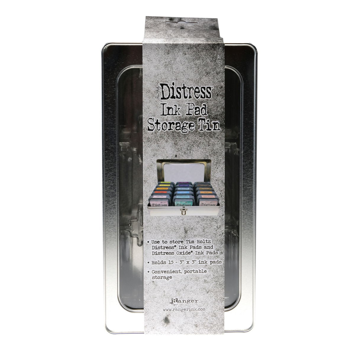 Tim Holtz Distress Ink Pad Storage Tin is the ideal storage solution for Tim Holtz Distress Ink Pads and Distress Oxide Ink Pads. Organize and transport Distress Ink Pads easily in this convenient tin. Features a clear window & hinged metal closure. This convenient, portable storage holds 15 - 3 in. x 3 in. Distress Ink or Oxide Ink Pads.