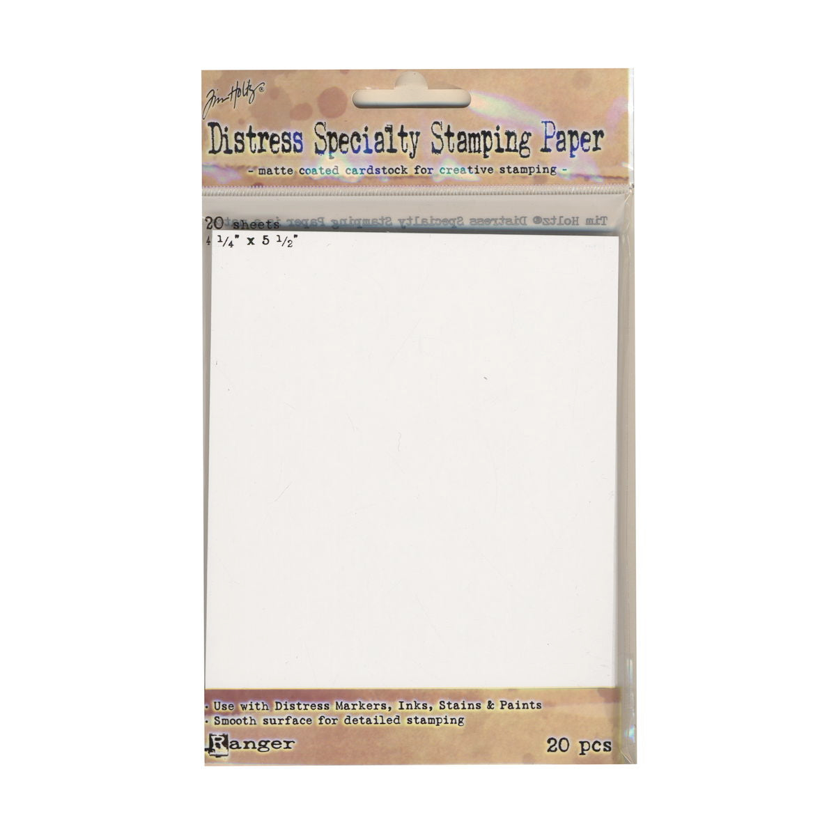 Tim Holtz Distress Specialty Stamping Paper is an ideal surface for to use with Distress Inks, Stains and Paint. The unique dual-sided matted coated paper holds up well to a variety of water-based techniques and offers a smooth surface for blending and coloring. The pre-cut 4 1/4 in. x 5 1/2 in. size is perfect for cardmaking.