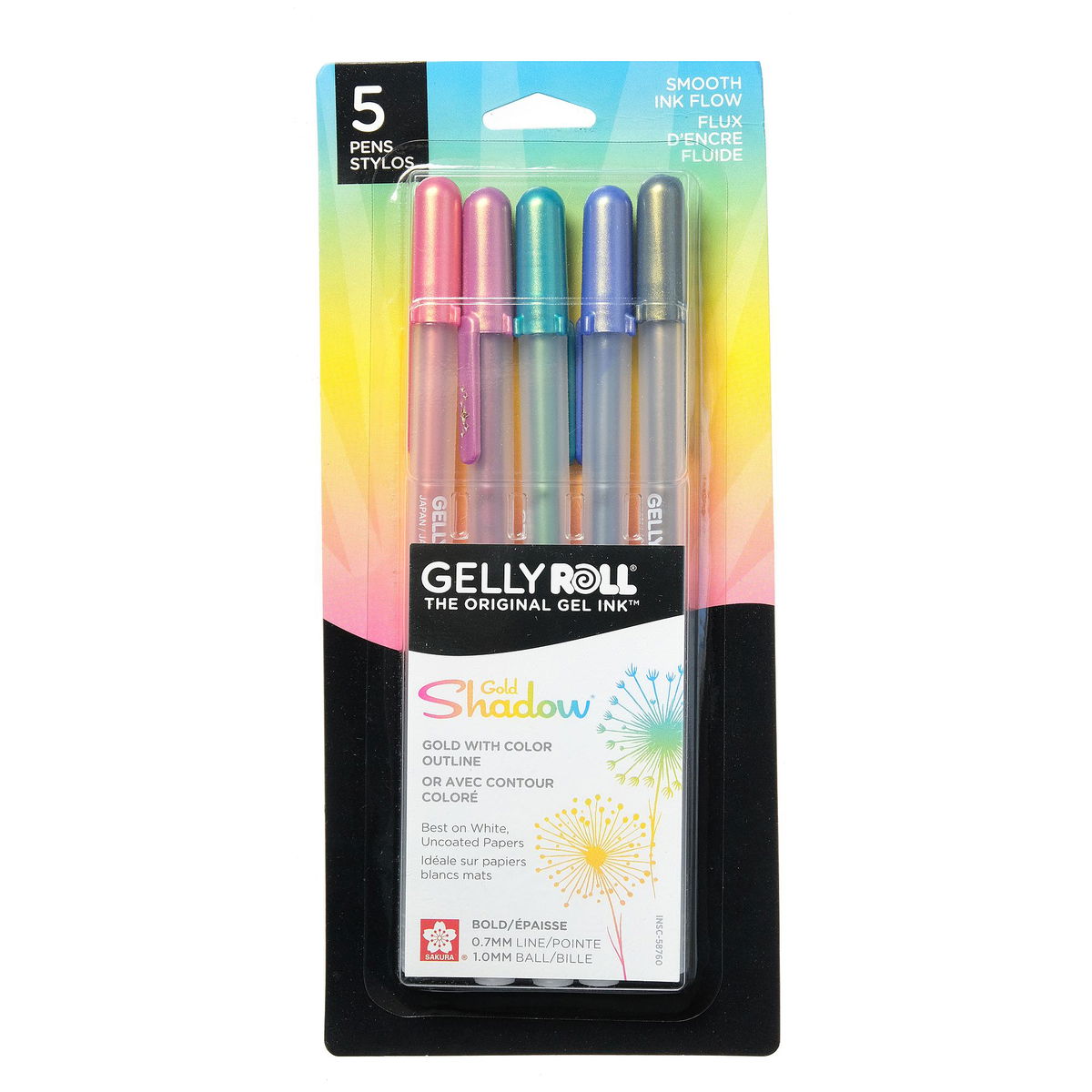Gelly Roll Gold Shadow Pens write in metallic gold with a brilliant colored border. Add a little magic to your writing with this elegant, shimmery gel ink that is perfect for events, invitations, handmade cards, lettering, and drawings. For the best results, use on bright white, fiber-based, porous papers. Available in a set of 5 with pink, lavender, green, blue and black border colors.
