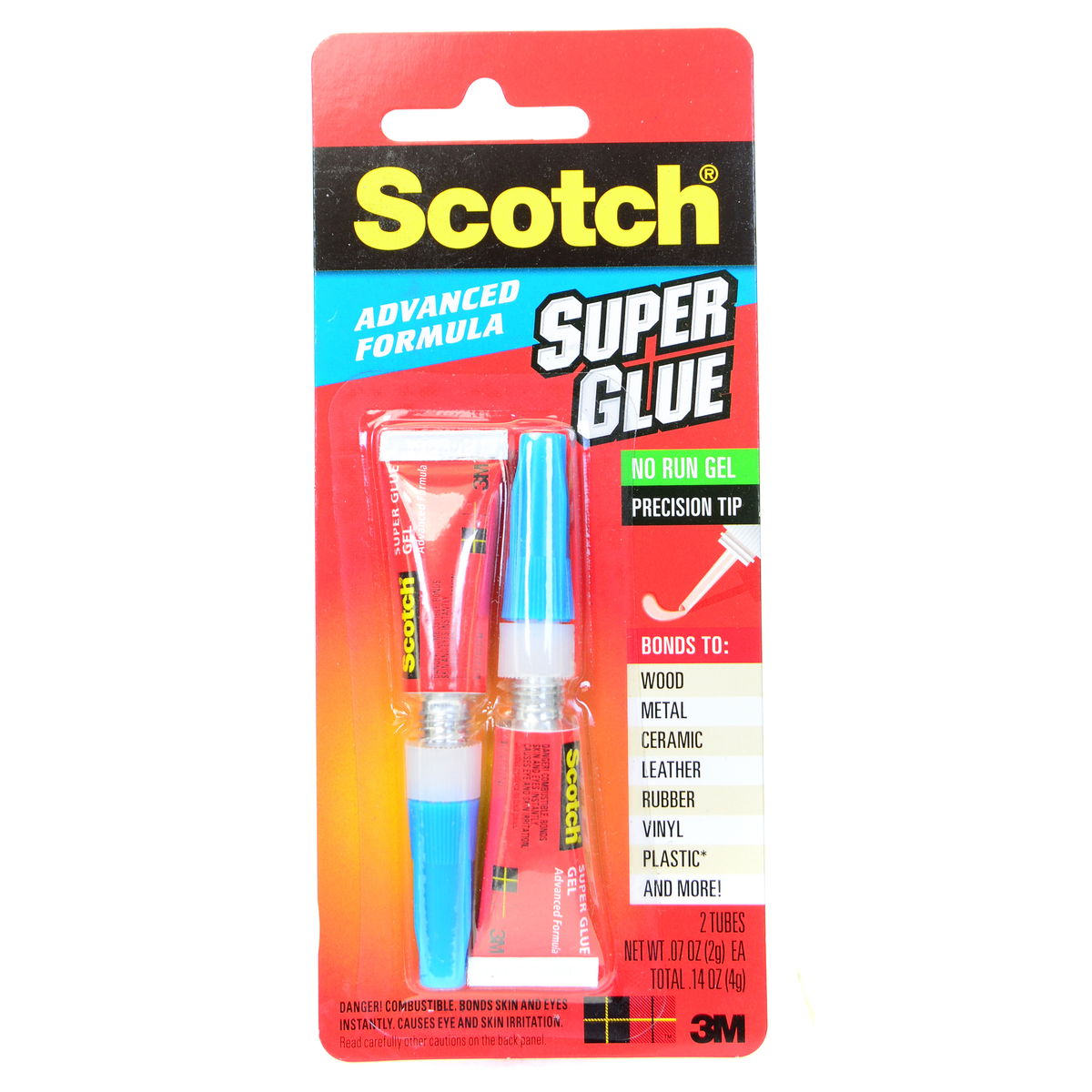 Scotch Advanced Formula Super Glue Gel is a fast-drying adhesive that combines improved bonding with precision application. This super glue bonds strongly to wood, metal, ceramic, leather, rubber, vinyl, and more. The glue's no run formula and precision tip provide more control. Pack of two 0.07 oz. tubes.