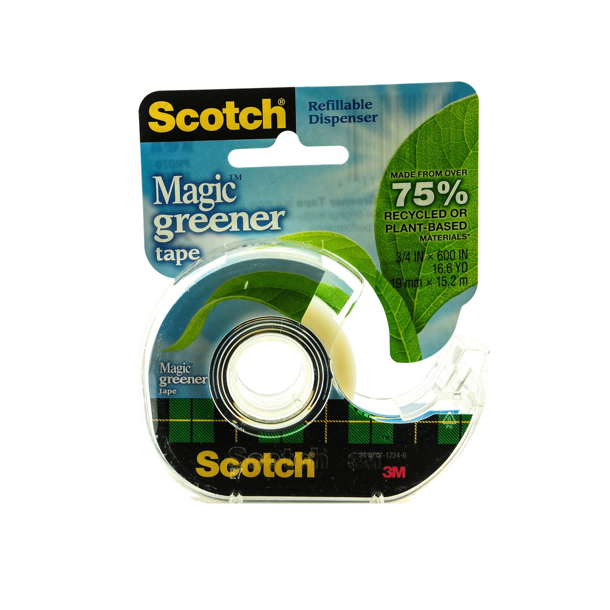 Scotch Magic Greener Tape was designed to work just like the Magic Tape that Scotch has produced for the last 50 years. This tape contains over 75% recycled or plant-based materials based on the weight of the product including the tape, dispenser, and packaging. The two-piece refillable dispenser and the core within the roll of tape are both made from 100% recycled plastic. The tape is made with a plant-based adhesive. Overall the tape is made from over 53% plant-based materials.