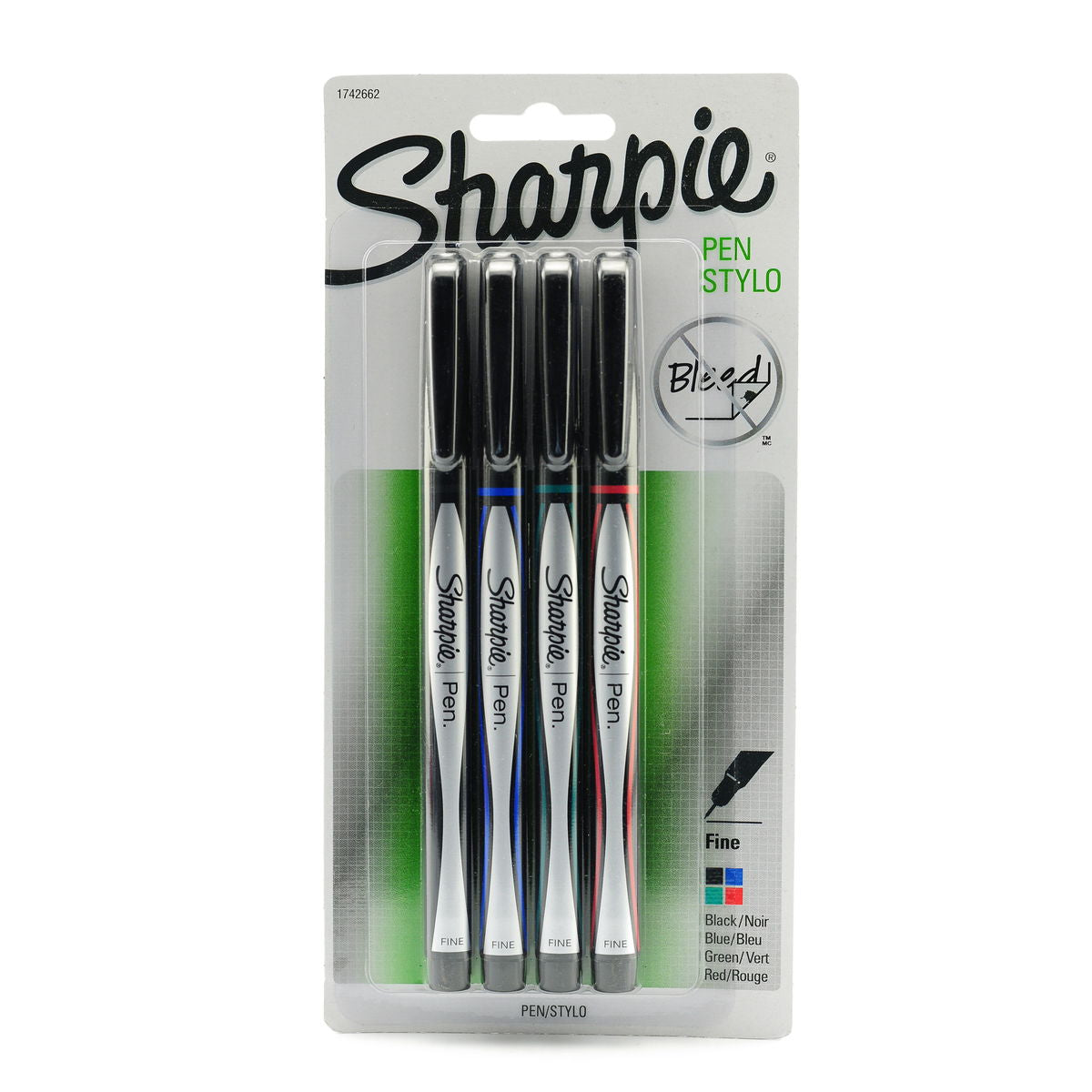 The Sharpie Pen features precise laydown and won't bleed through paper. The Assorted 4-Pack includes fine point Sharpie Pens in black, blue, red and green.