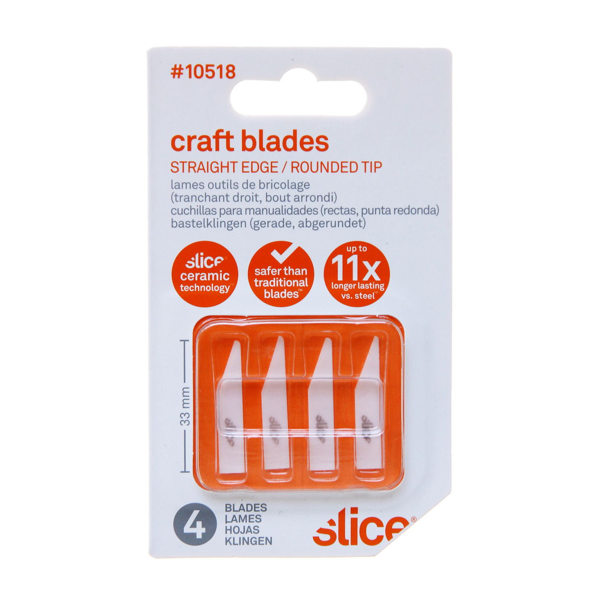 Slice Craft Blades with straight edges and rounded tips are compatible with multiple Slice tools, including Craft Knives, the Precision Knife, and the Scalpel. Ideal for controlled and precise cuts, the blades are safe to the touch because they have a unique finger-friendly edge and rounded tip. The blades are also non-conductive for added safeguarding and don t require a sharps box for disposal. Each blade in this pack of four is highly durable, lasting 11.2x longer than traditional blades, and they never rust and don t have an oil coating, so are significantly less likely to contaminate your materials. Finger-friendly blade is the only safety blade on the market Rounded tip further reduces risk of injuries Non-conductive blade for added safety Chemically inert blade that never rusts No oil coating Slice blades last 11.2x longer than traditional blades Easy disposal with no sharps box requirement Pack of 4 blades to support multiple tools or keep as spares Great for: Arts and crafts Slicing plastics and decals Intricate shapes and precise cuts Manipulating laboratory samples