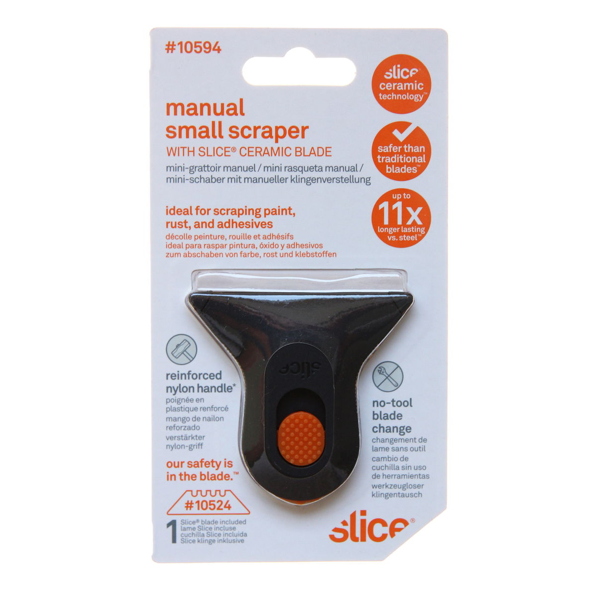 The Slice Manual Small Scraper is safe and nimble, allowing you to easily scrape with confidence. A durable handle fits comfortably in your (left or right) hand, and the compact, lightweight design means it s highly portable. This tool s finger-friendly blade is safe to the touch and can be manually retracted when not in use for additional protection. Slice remains the first choice for safety and effectiveness in industrial settings and is now recognized as the leading safety tool in homes. From its daily use on construction sites to DIY renovation projects, the Manual Small Scraper makes people and places safer. Finger-friendly blade is the only safety blade on the market Compact, lightweight design, so it is highly portable An easy-grip slider allows you to manually retract the blade when not in use Suitable for left- and right-handed users Slice blades last 11.2x longer than traditional blades Great for: Scraping wallpaper, glue, stickers, paint, residue, and adhesives Working with challenging angles and small surfaces DIY household projects