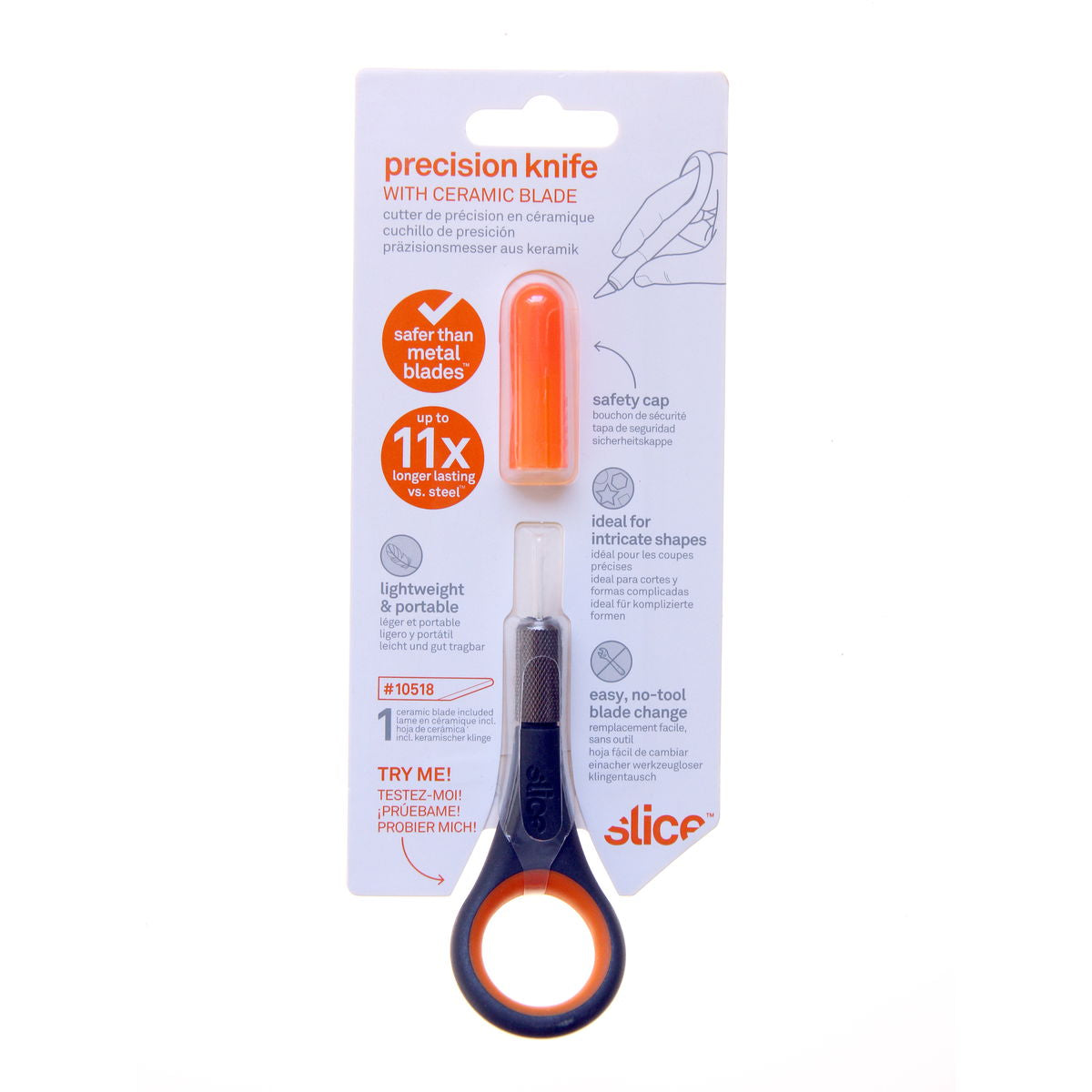 The Slice Precision Knife makes cutting intricate shapes easier, safer and more comfortable. The tool has an innovative soft and angled finger hole optimized for comfort and steadiness and a cross-hatched grip handle, allowing complete control over your work. The knife s blade is finger friendly , and a safety cap provides additional safeguarding. Lightweight and highly portable, it s suitable for left- and right-handed users and the finger hole also means it hangs for easy storage. Slice remains the first choice for safety and effectiveness in industrial settings and is now recognized as the leading safety knife in homes. From cutting cardstock and tissue paper to slicing tape and plastics, the Precision Knife makes people and places safer. Finger-friendly blade is the only safety blade on the market Innovative soft, ergonomic finger hole for comfort and precision Cross-hatched grip handle for additional control Safety cap to further protect you Lightweight and portable for ease-of-use Suitable for left- and right-handed users /li>Slice blades last 11.2x longer than traditional blades Great for: Intricate shapes and precise cuts Mylar stenciling Slicing plastics and decals