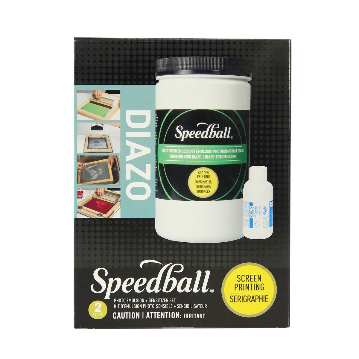 Together at last! Speedball introduces a set combining Diazo Photo Emulsion and Diazo Sensitizer in and eash grab-and-go box. The photo emulsion method of screen printing allows artists to create a photographic stencil featuring highly-detailed images. Speedball s Diazo Photo Emulsion & Sensitizer offer professional-grade results and remove the need for expensive equipment and darkrooms. For use with polyester screen fabrics, Speedball s Diazo Photo Emulsion & Sensitizer may be used with any water-soluble or solvent-based ink and can be easily removed with Speedball s Photo Emulsion Remover. Set contains: 26.4 fl. oz./780.7 ml Diazo Photo emulsion 2 oz./8.85 g Diazo Sensitizer