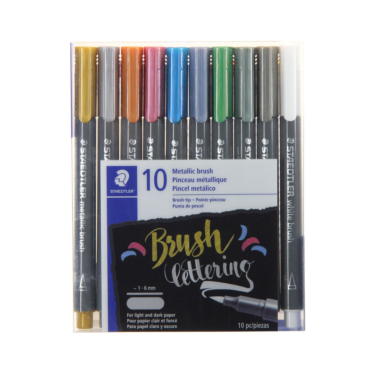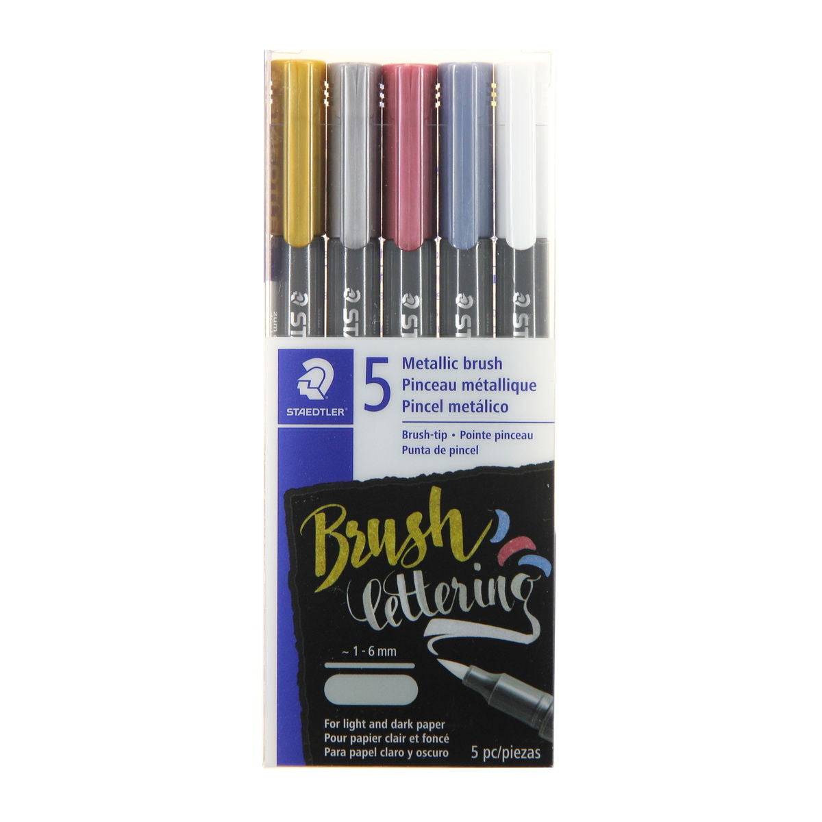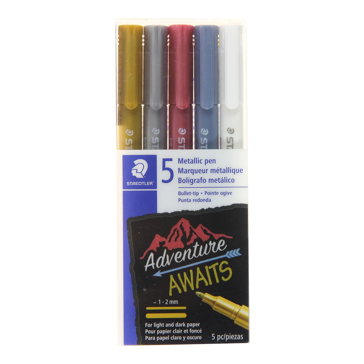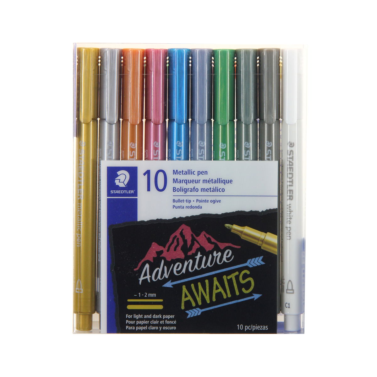 Staedtler Metallic Markers feature opaque shimmering inks for stunning colors on light and dark papers. The versatile ink is smudge-proof on paper and card but also writes on wood, glass, metal, plastic, and other smooth surfaces. The non-permanent ink can be wiped off of non-porous surfaces with a damp cloth. Metallic Markers come in three tip styles for lettering and drawing: bullet tip, flexible brush tip, and calligraphy chisel tip.