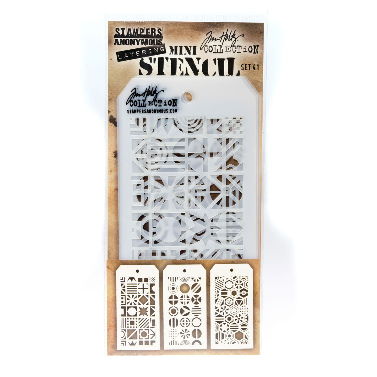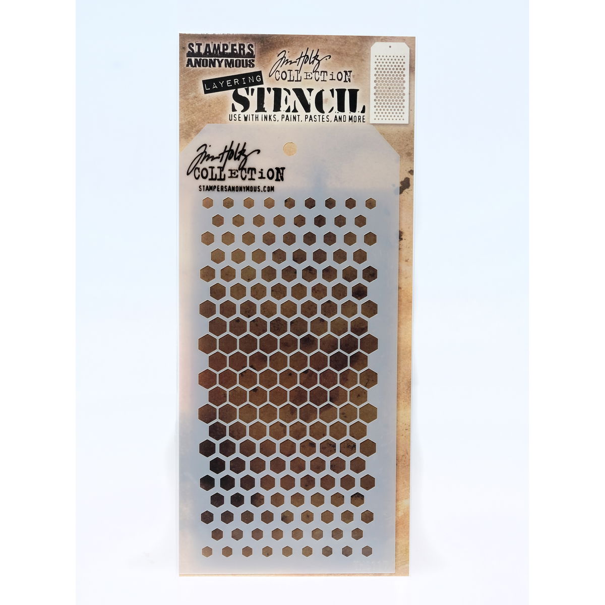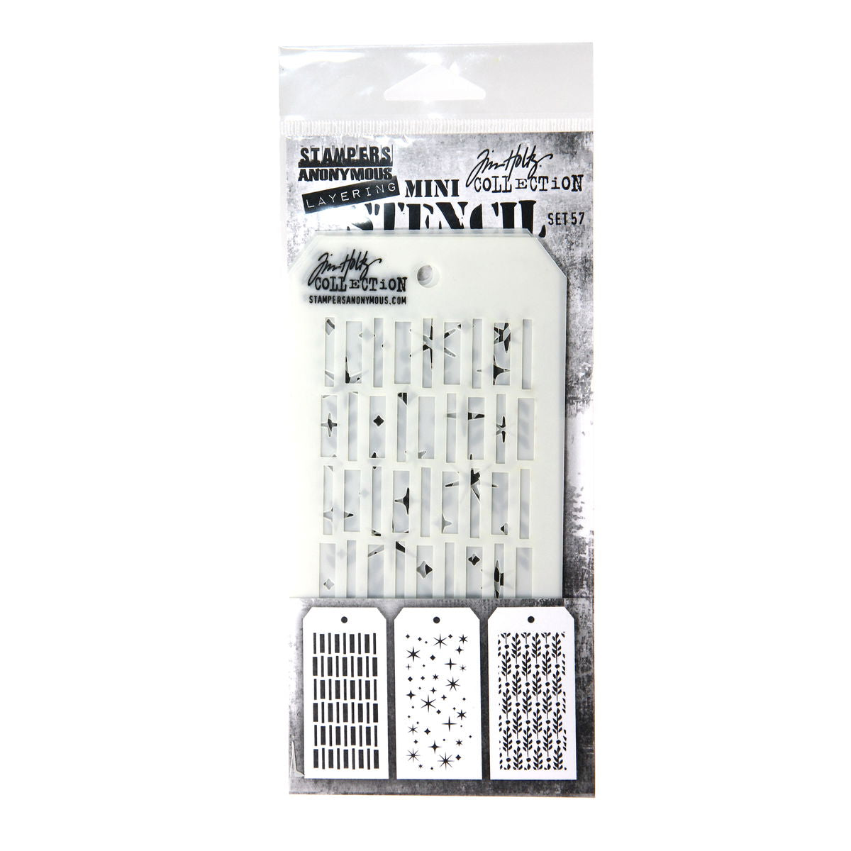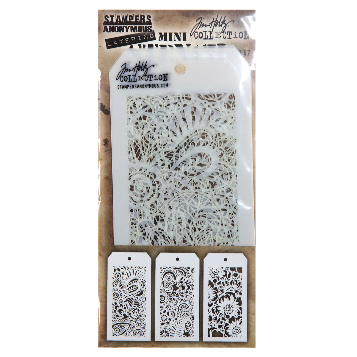 Make interesting backgrounds while adding texture and dimension to all of your paper crafting projects with these Tim Holtz Layering Stencils. They are perfect to use with the Distress ink, paint and stain lines, but are also suitable for any of your favorite brands. Each stencil is designed in a 4 1/8 in. x 8 1/2 in. tag shape with a convenient hole at the top for attaching to a binder ring to convenietly store your stencils together.