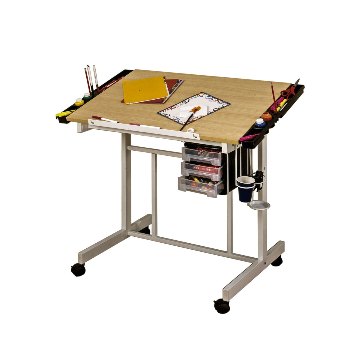This Deluxe Craft Station is 30 1/2 in. tall and has a 24 in. x 36 in. working surface with finger touch adjustable angle. Adjusts to 45 degrees. Other features include casters for mobility, two side trays (for paints, brushes, pens, and other accessories), three plastic molded slide-out drawers for storage, slide-up pencil tray, and a metal frame holder with drip tray for glue gun. The base is white metal and table top is maple colored.