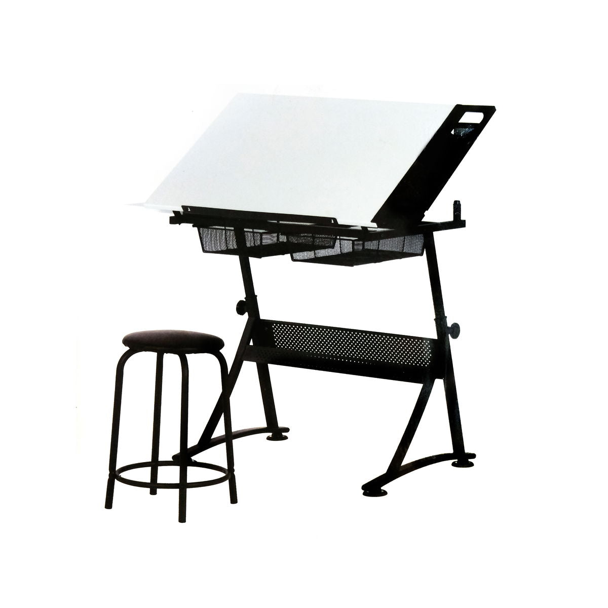 The Studio Designs Fusion Craft Center is a welcome addition to any hobby room. It features a surface with an adjustable height from 26.75 to 35.5 (in 1.75 increments), an adjustable angle up to 60-degrees, and a slide shelf for an extra flat workspace. Your supplies will always be at hand with the craft station s 24 slide-up pencil ledge, long bottom shelf, two wire mesh storage drawers, and Premier Metal Art Tray with features a swivel cup and the Studio Designs Flexible Foam Organizer that accommodates pencils and markers up to 10mm. The durable Fusion Craft Center boast a steel frame construction and four wide floor levelers for maximum stability. Includes is a 21 high padded stool.