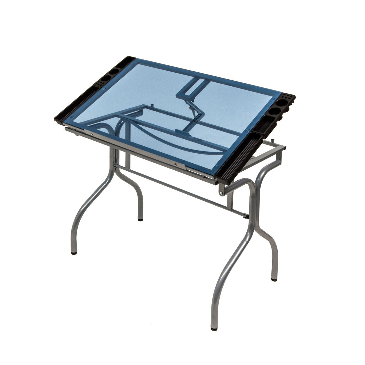 This Futura Folding Craft Station features a tempered blue safety glass top, allowing the station to be used as a light table. This table also includes four removable side trays for supplies, a heavy gauge steel construction for durability, a 24-inch slide up pencil ledge, and four floor levelers for stability. More importantly, the station folds up so that you can store your useful craft station out of the way! This table measures 42 x 25 x 30 , with a table surface area of 36 x 25 . No tools are required for assembly, and table assembles in 15 minutes or less.