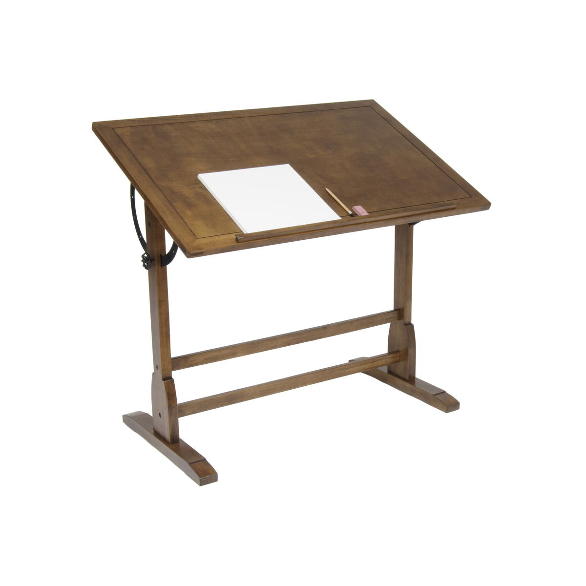 Overall Dimensions: 41.75"W x 30"D x 34"-49.5"H Main Work Surface: 41.75"W x 30"D Adjustable Angle Table Top from Flat to 90 Degrees Antique Design and Finish Built-in Pencil Groove with 24" Pencil Ledge Solid Hard Wood Frame for Stability