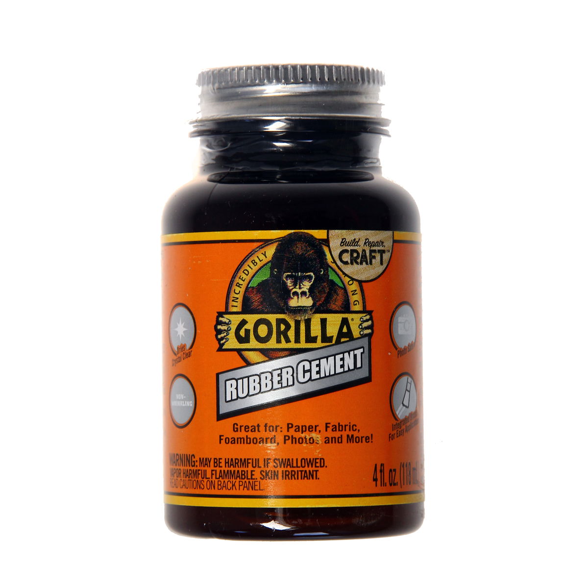 Gorilla Rubber Cement is non-wrinkling and dries crystal clear. Use on paper, fabric, foamboard, photos and more. An intergrated brush is inside the lid for easy application.