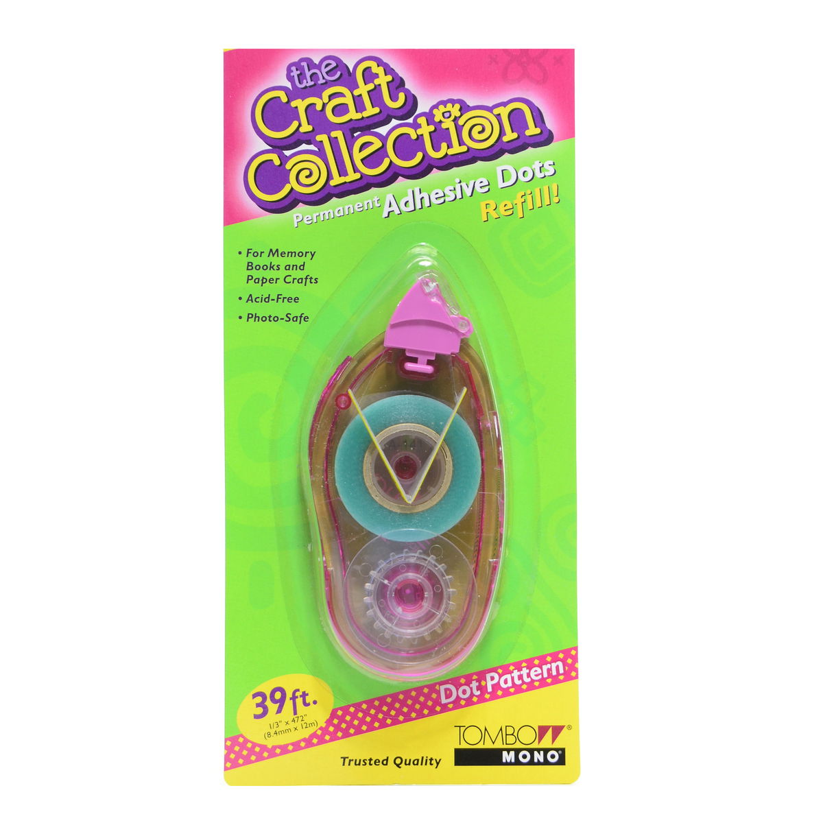 Conveniently apply adhesive tape or dots without the mess of glue. Ergonomic dispenser precisely applies a film of glue smoothly, quickly, and cleanly. Mono Adhesive Dots applies a strip of unique permanent diamond dot adhesive. Available in permanent for strong bond and repositionable for self-sticking and removing. Repositionable bond with stronger adhesion, removes cleanly without leaving residue. Acid-free: ideal for use with memory albums and archival materials. CK OK and Photographic Activity Test (PAT) ANSI IT9.16 approved. Non-refillable dispenser contains 1/3 in. x 335 in. of adhesive. Refillable dispenser and refills contain 1/3 in. x 472 in. of adhesive.