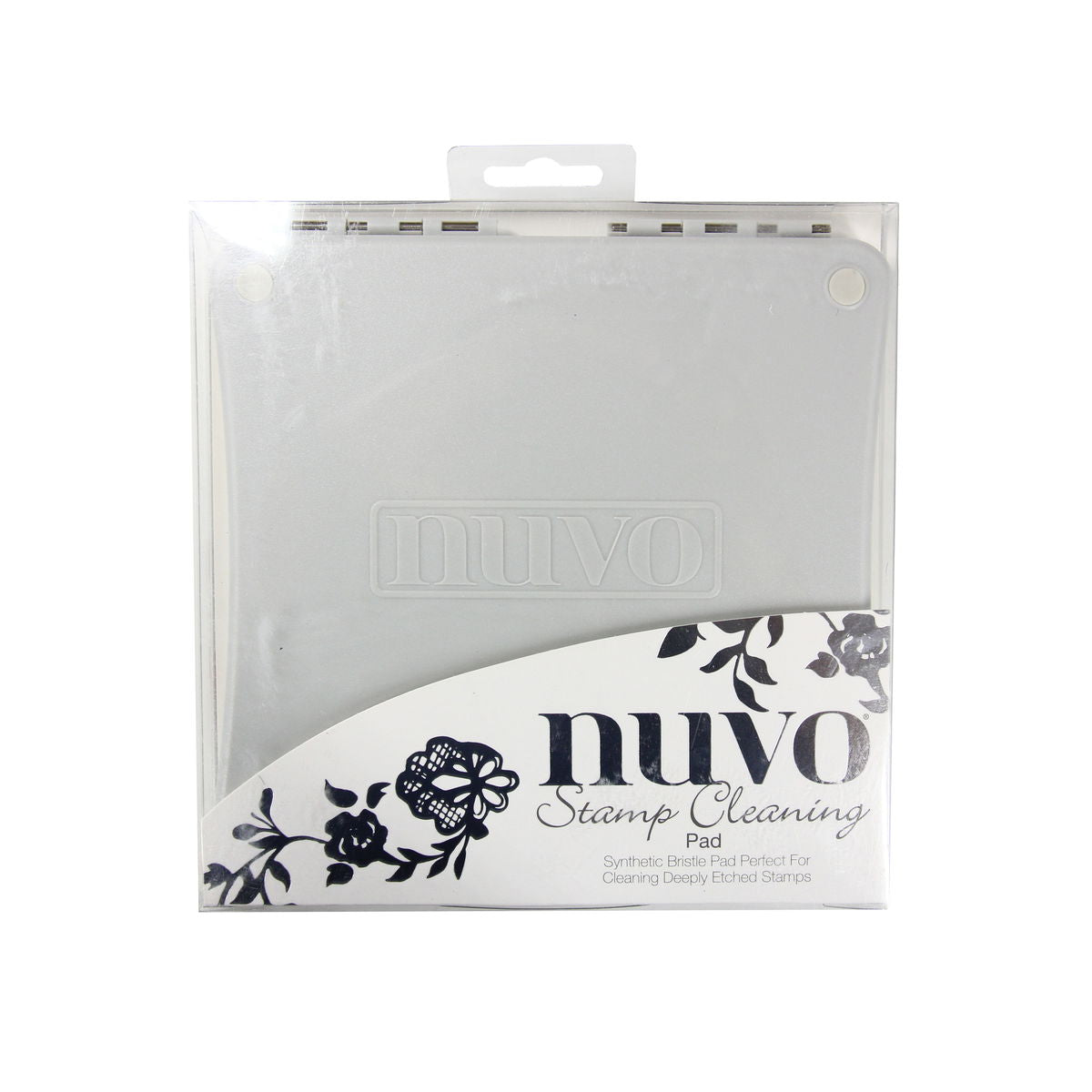 For deep cleaning, Nuvo Stamp Cleaning Pad is the 'must have' product for both rubber and clear stamps! The hinged plastic case opens to provide 2 synthetic bristle mats, perfect for cleaning deeply etched stamps. The bristle mats measure 6.3 in. x 6.7 in. each. The plastic case has non-slip feet to prevent slippage when in use and a magnetic locking mechanism for easy portability when not in use. Use in conjunction with Nuvo Stamp Cleaning Solution.
