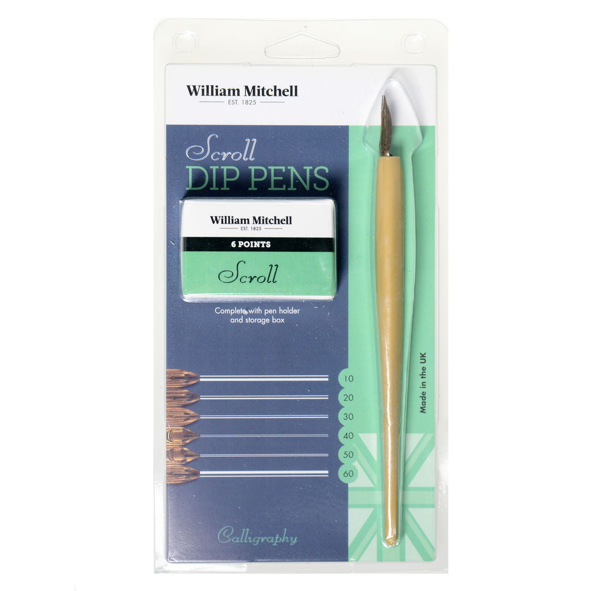 British based William Mitchell Calligraphy has been designing and manufacturing exceptional pens for almost 200 years and are the first choice of professional calligraphers and aspiring students. The double edge Scroll Dip Pens are ideal for double line calligraphic effects and decorative borders. Available in 6 sizes, each nib has a narrow and wide tine and does not require a reservoir. The set includes a pen holder and a nib storage box.