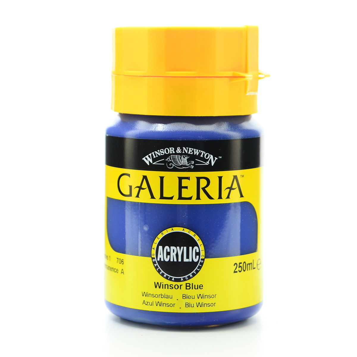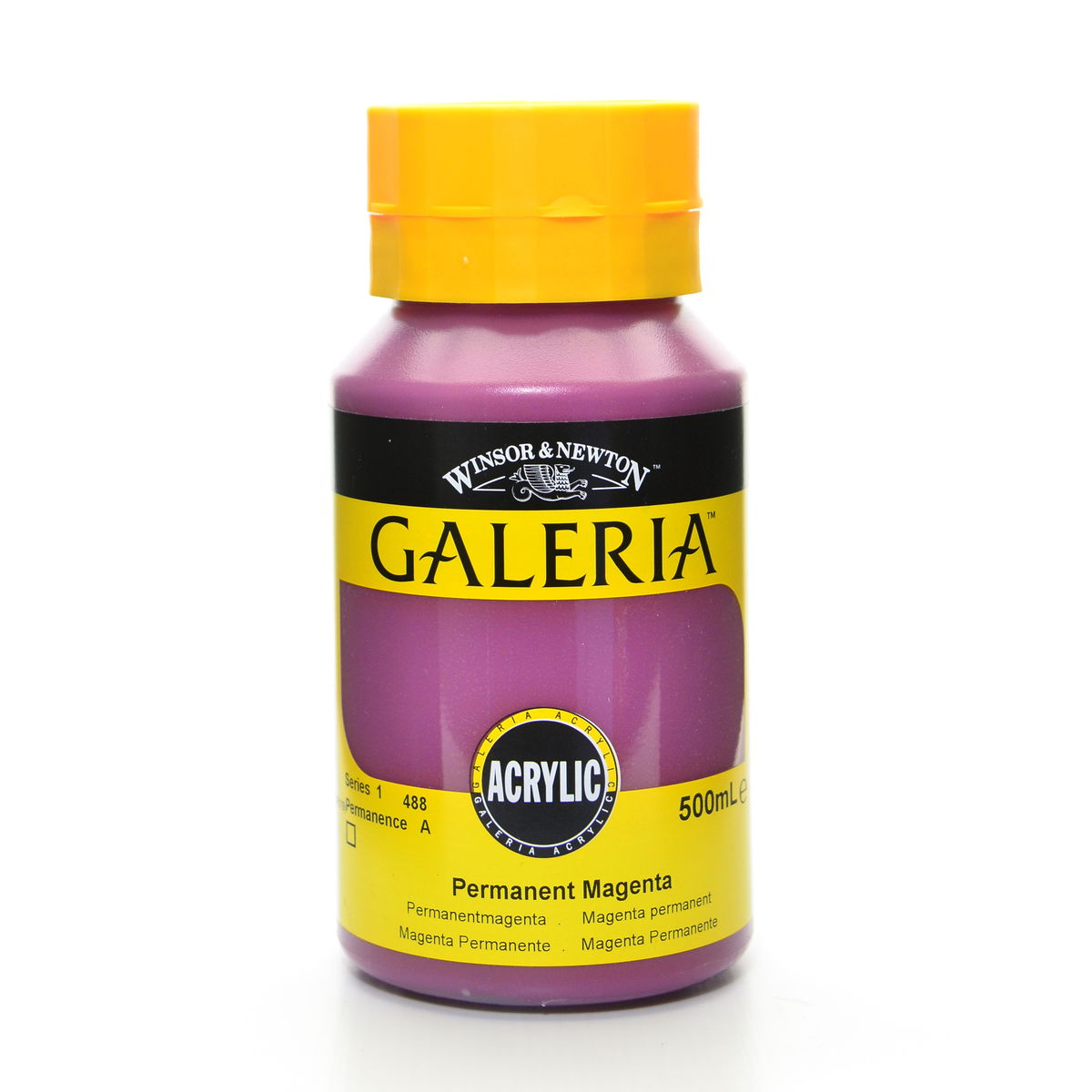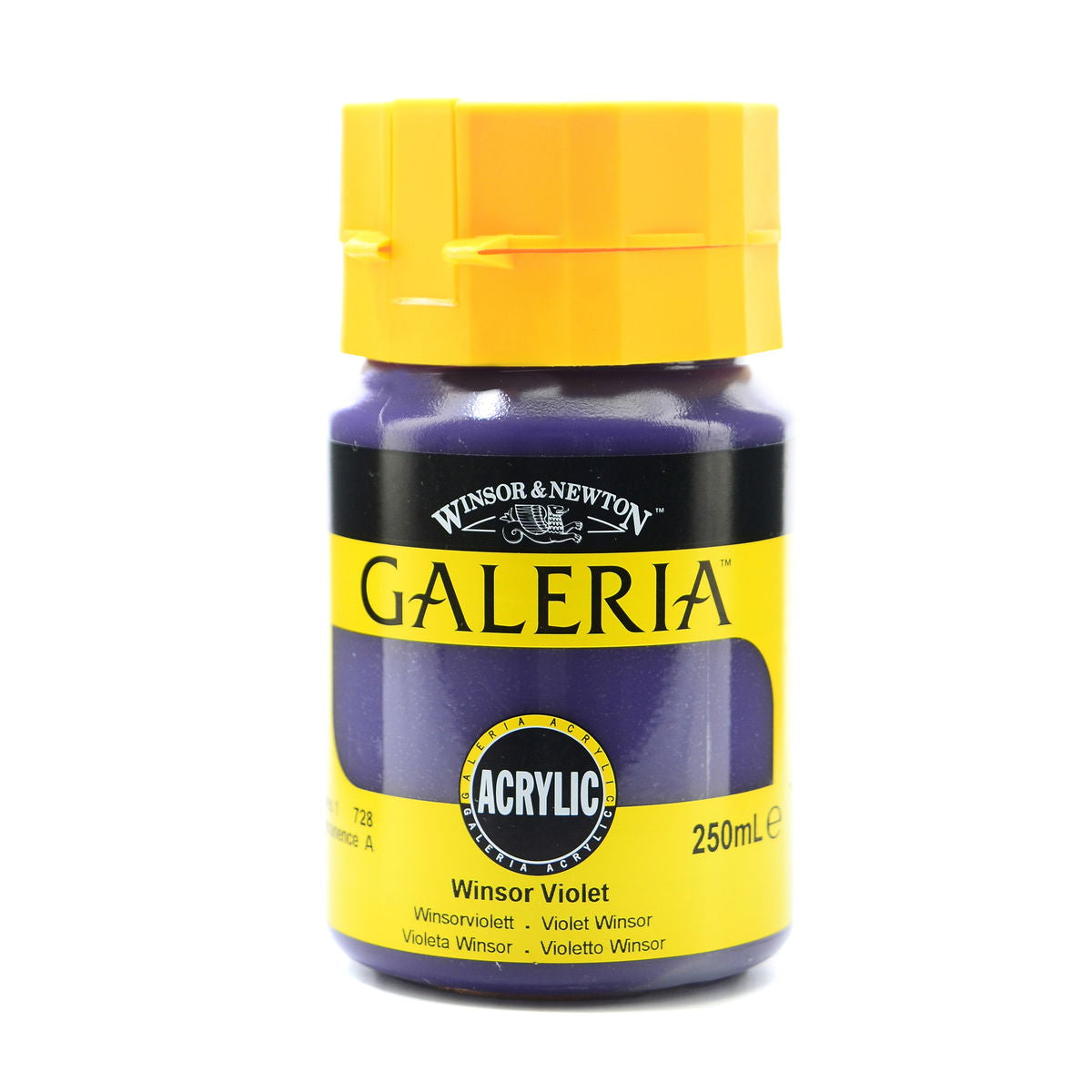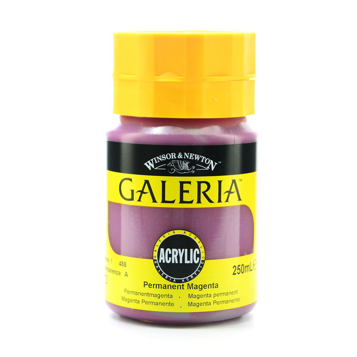 Galeria acrylic colors are for artists who require large quantities of quality acrylic paint at an affordable price. They have a smooth, free-flowing consistency that maintains its body and retains brush marks, and they can be easily diluted with water. These paints are extremely versatile and are suitable for a variety of techniques. Galeria acrylics have also been formulated to be fully compatible with the complete range of Winsor & Newton Artists Acrylic Colours and mediums. They are available in 60 ml and 200 ml tubes or 250 ml and 500 ml plastic squeeze bottles. The convenient wide necked squeeze bottles are fitted with nozzle caps that allow acrylic color to be applied smoothly and directly to the palette or canvas.