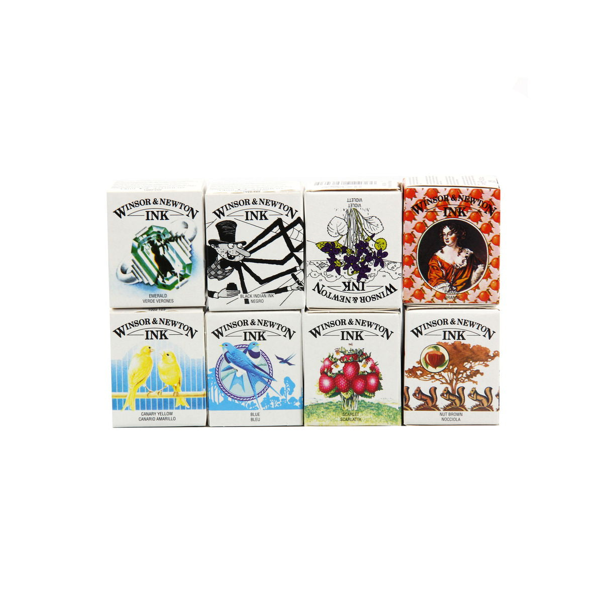 Winsor & Newton Drawing Inks are formulated from a series of soluble dyes in a superior shellac solution. They offer brilliant, fast-drying colors that are fully intermixable and easily diluted. They can be applied with a brush, pen, or airbrush which makes them perfect for illustrators, designers, calligraphers, and artists. This introductory set contains eight colors in 14 ml bottles: black (Indian Ink), blue, scarlet, canary yellow, emerald, nut brown, orange, and violet. Also available in individual jars.