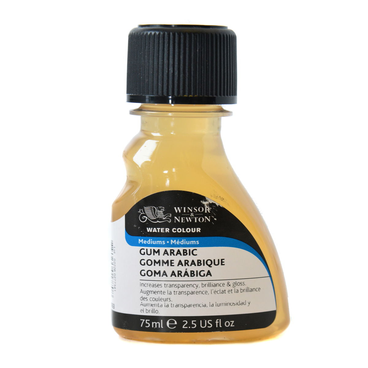 Gum Arabic is a pale colored solution that increases the gloss and transparency of watercolors. It can be thinned with water.
