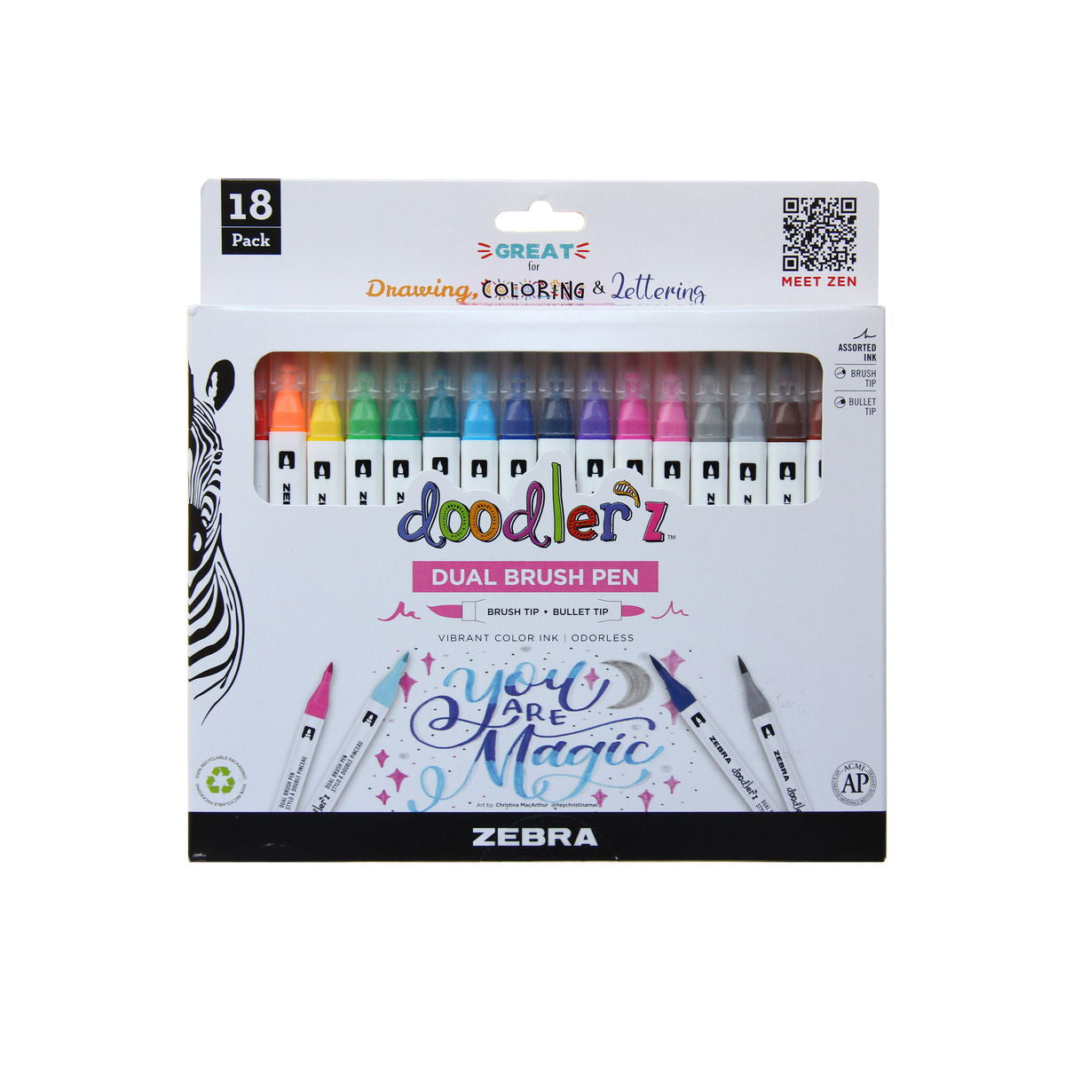 Create, draw, color, and more! Zebra doodler z Dual Brush Pens feature a double ended design with a flexible brush tip for thick and thin strokes and a bullet tip for writing and underlining. A water-based ink allows for watercolor effects when using them with a paint brush or water brush pen and AP certification makes them safe for students. Available in a set of 18 vibrant colors.